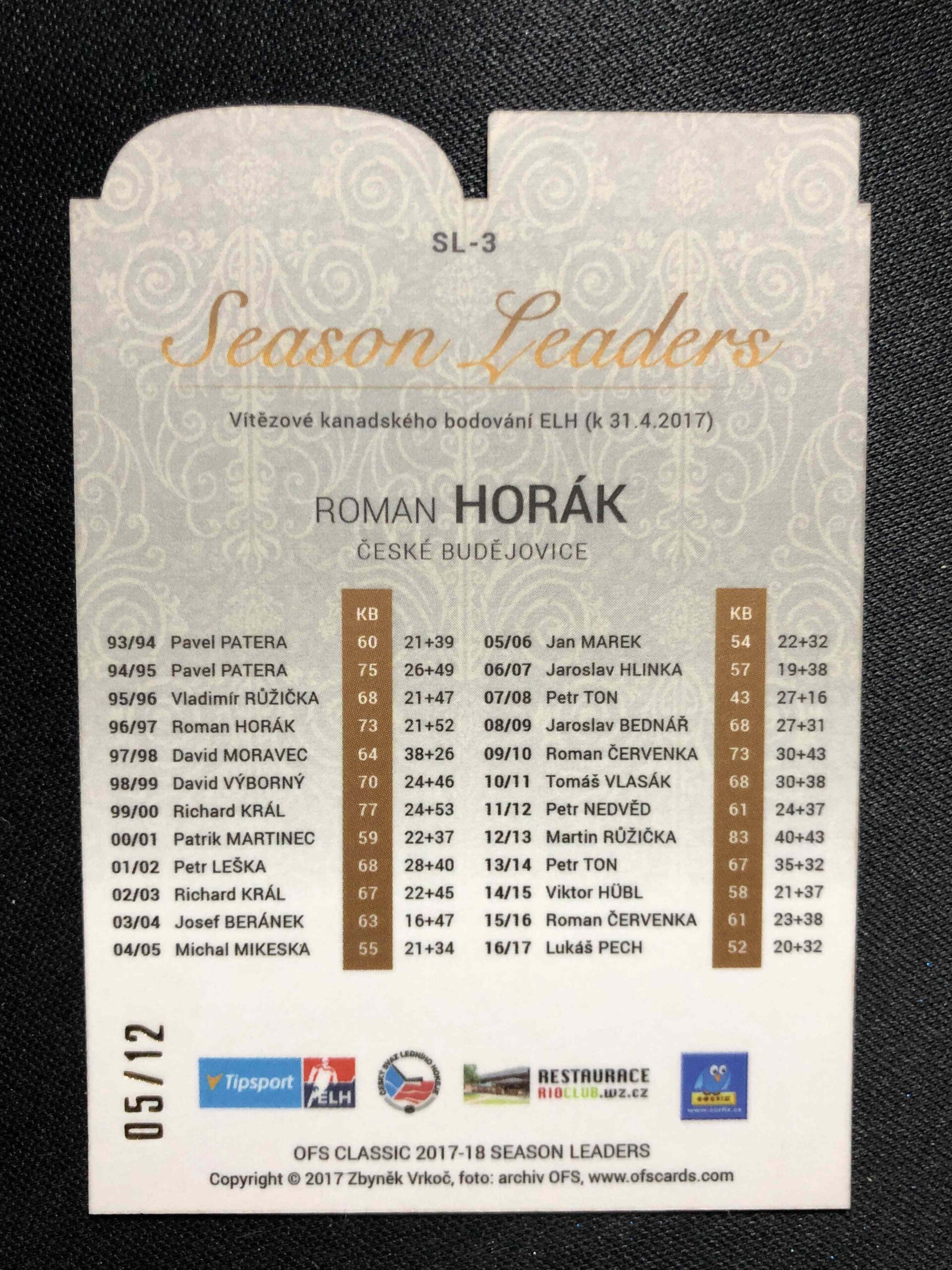Sběratelská karta 2017/2018 OFS Classic Seasonal Leaders AUTO SL-3 Roman Horák AUTO 05/12
