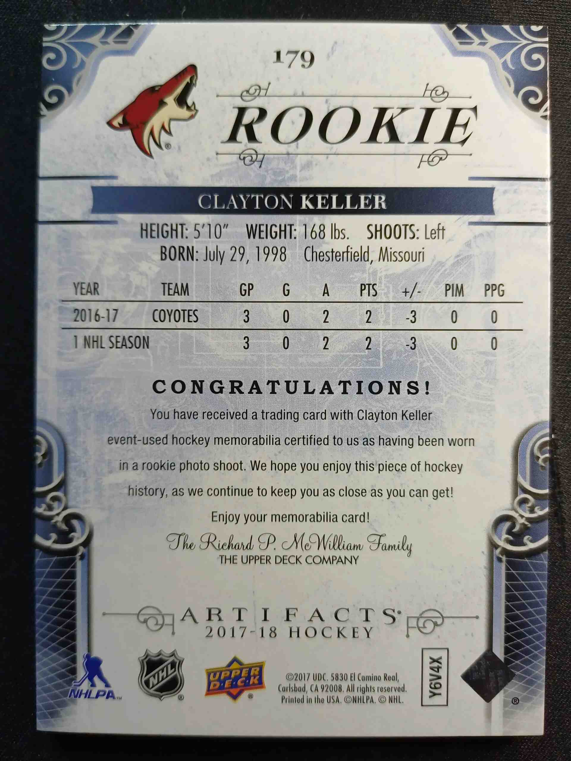 Sběratelská karta 2017/2018 Upper Deck Artifacts Emerald Patch Rookie 179 Clayton Keller Patch 11/99
