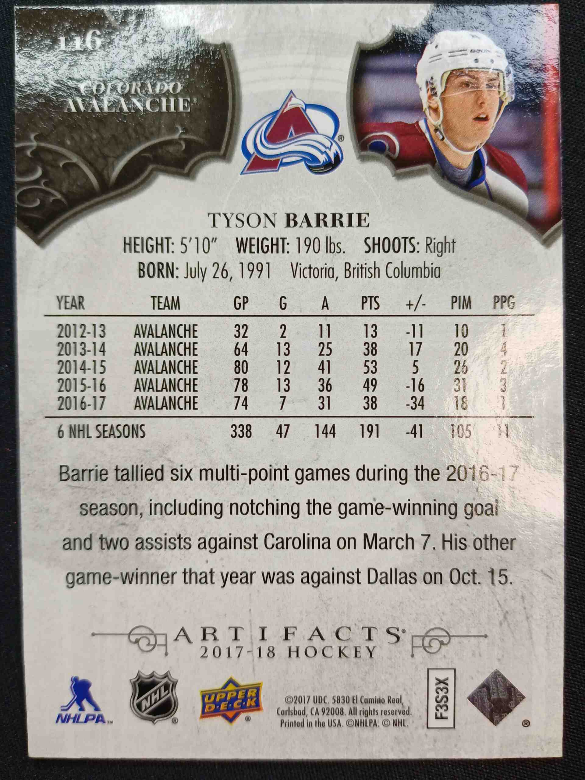 Sběratelská karta 2017/2018 Upper Deck Artifacts Orange 116 Tyson Barrie Paralel 13/55