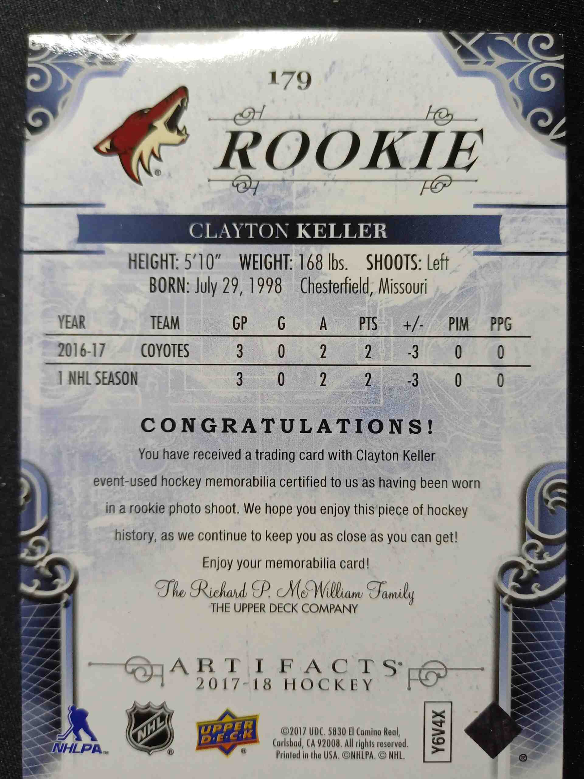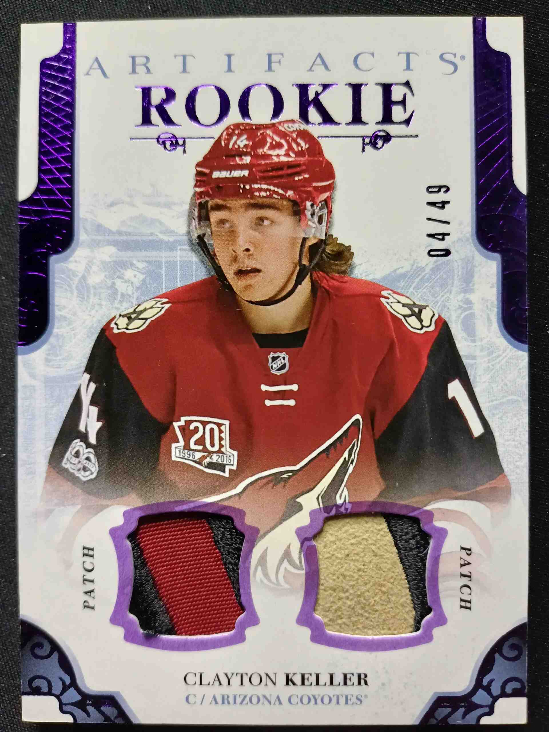 Sběratelská karta 2017/2018 Upper Deck Artifacts Purple Materials 179 Clayton Keller Patch 04/49