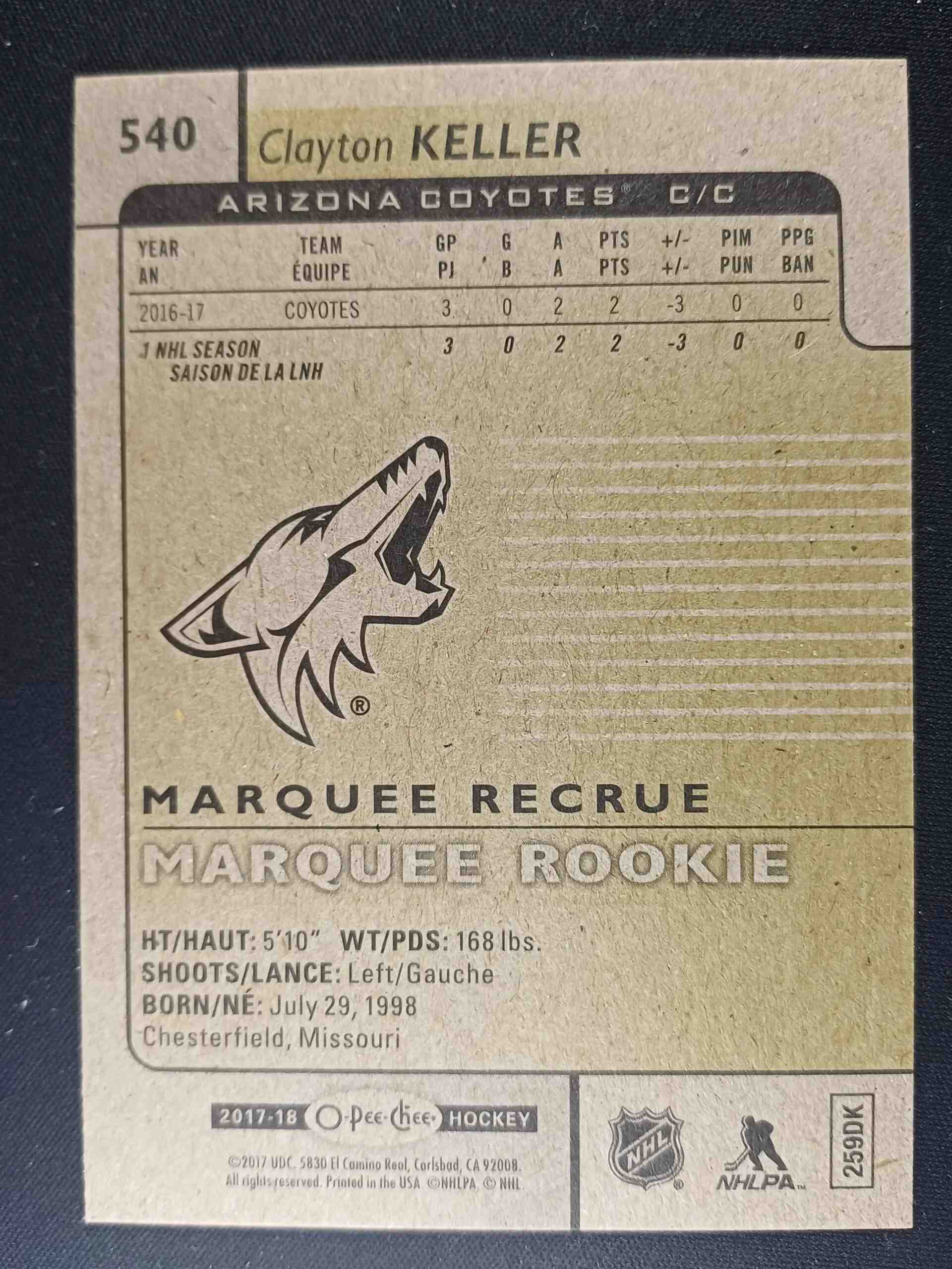 Sběratelská karta 2017/2018 Upper Deck O-Pee-Chee Marquee Rookie 540 Clayton Keller