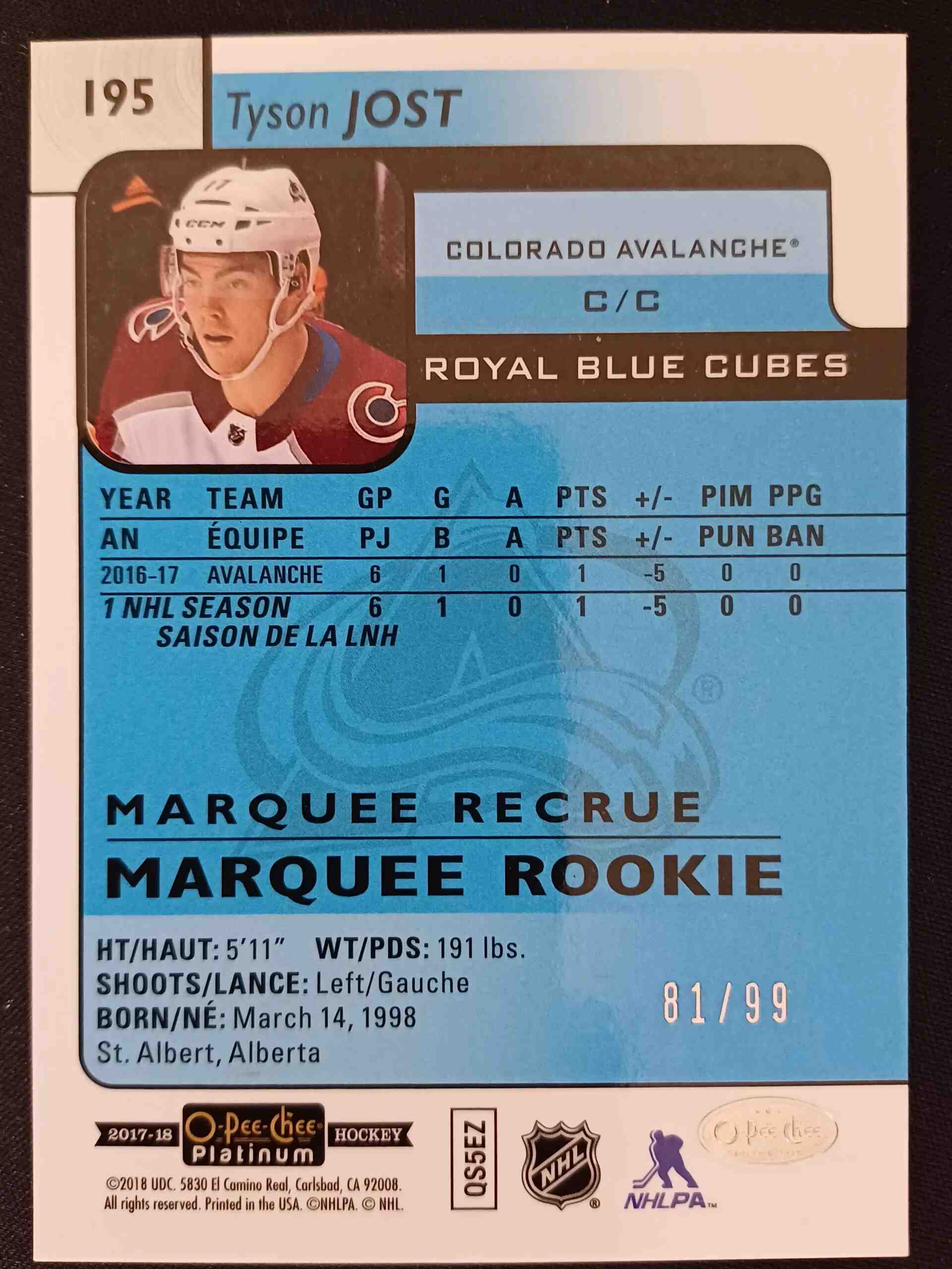 2017/2018 Upper Deck OPC Platinum Royal Blue Cubes 195 Tyson Jost Paralel 81/99