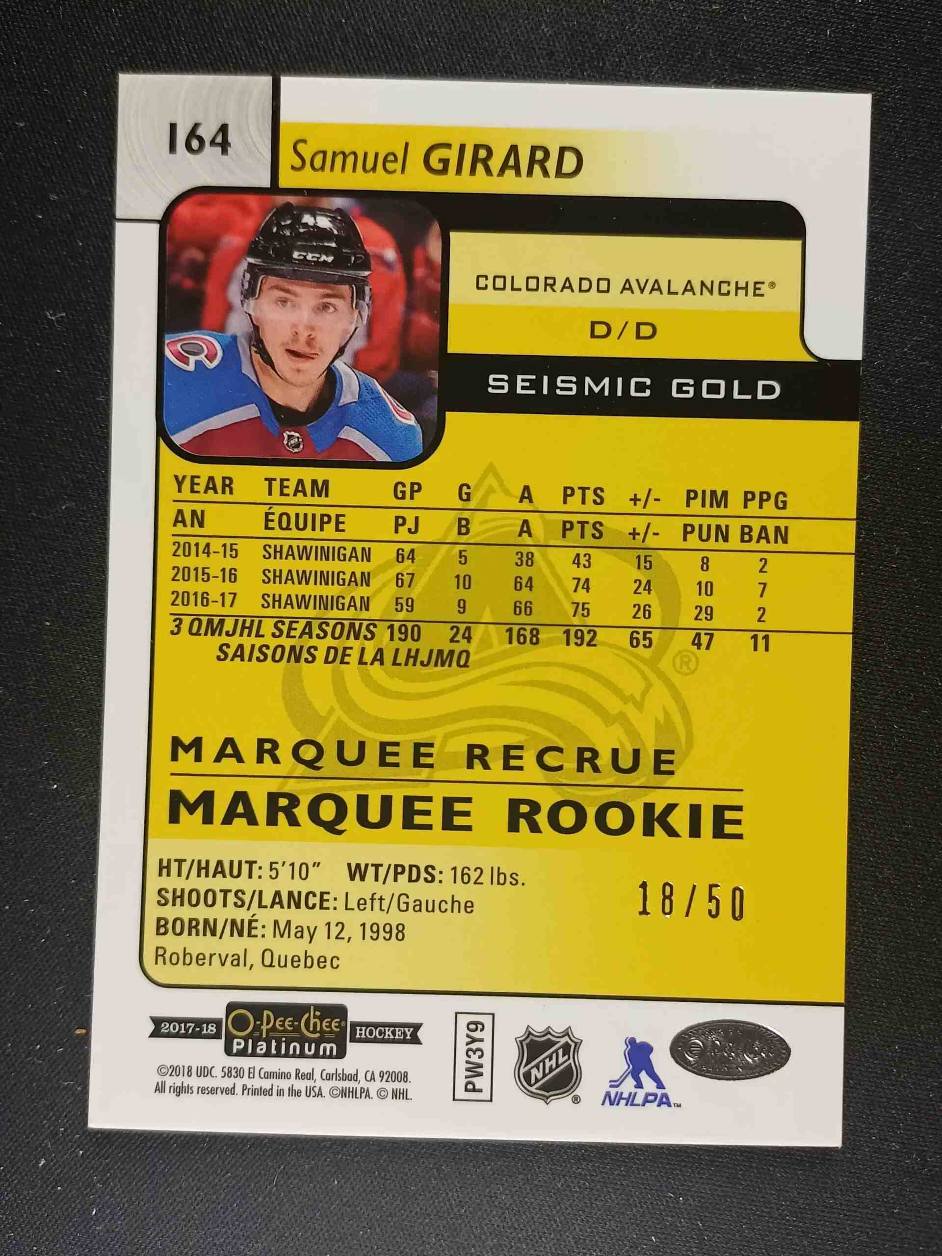 Sběratelská karta 2017/2018 Upper Deck OPC Platinum Seismic Gold Marquee Rookie 164 Samuel Girard Paralel 18/50