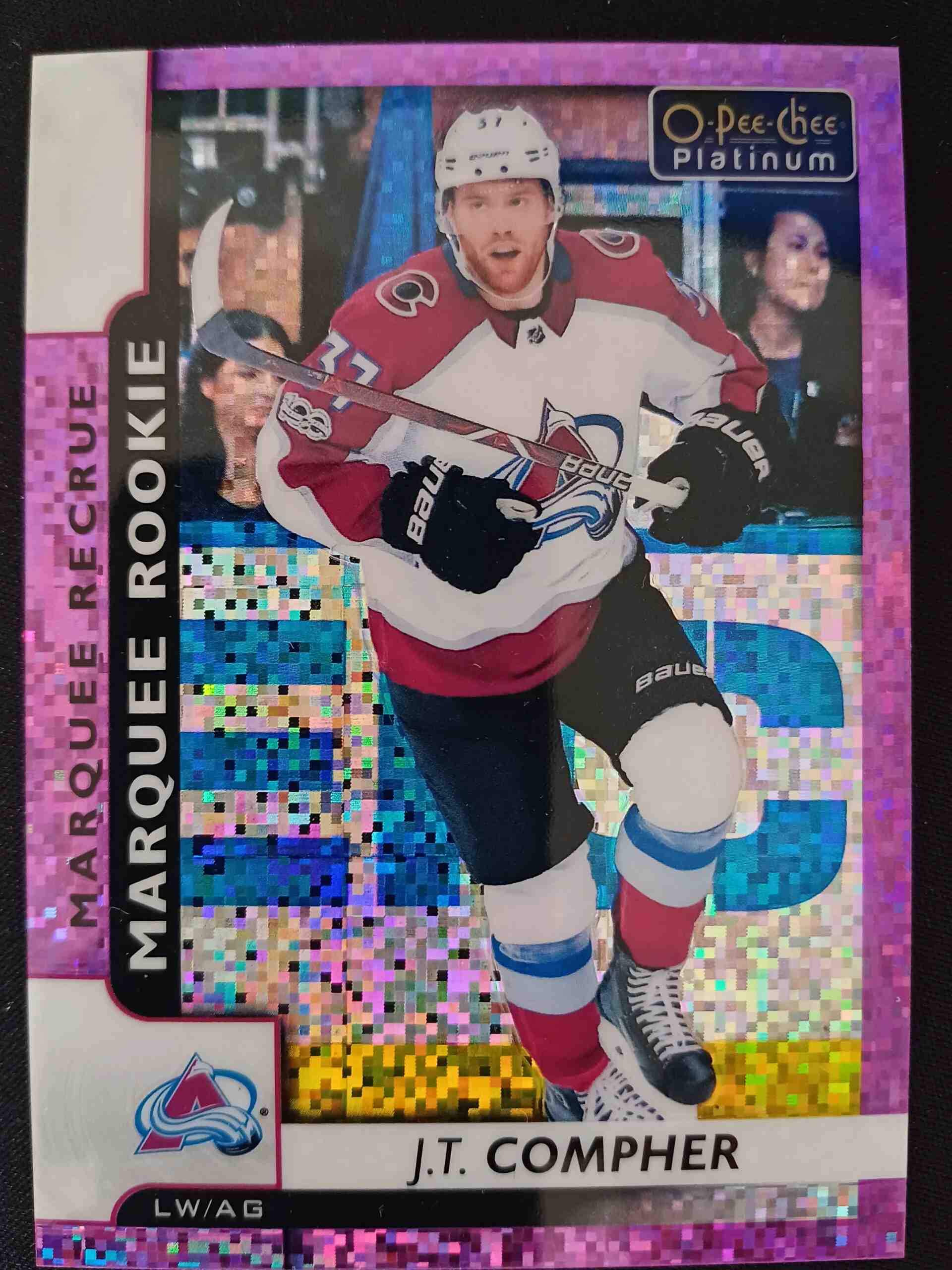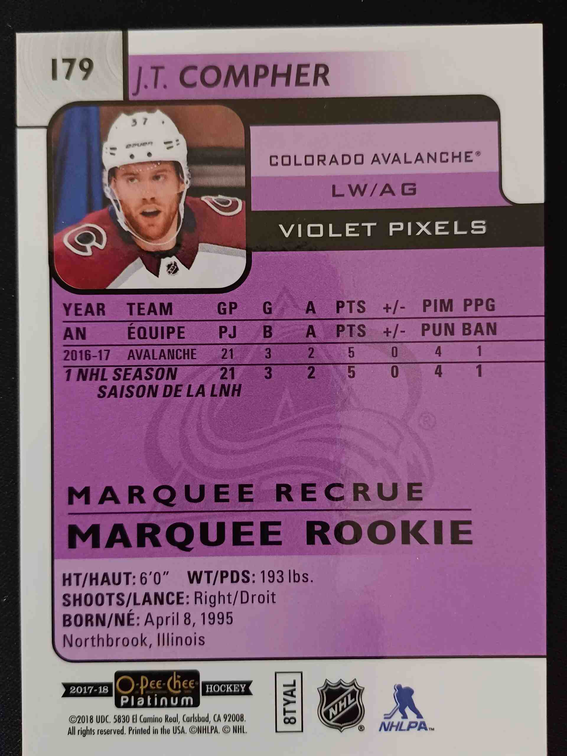 Sběratelská karta 2017/2018 Upper Deck OPC Platinum Violet Pixels Marquee Rookie 179 J.T. Compher Paralel