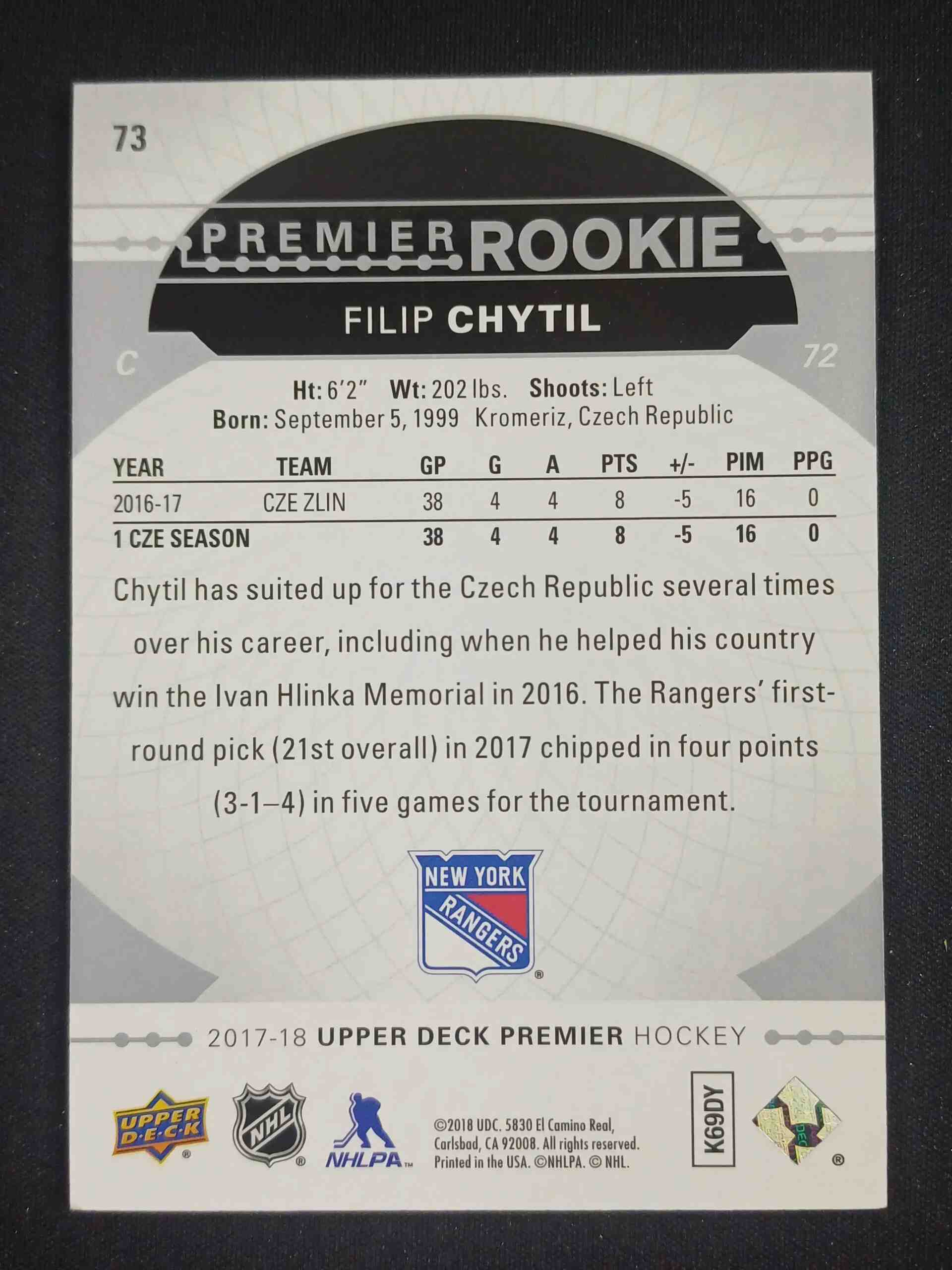 Sběratelská karta 2017/2018 Upper Deck Premier Premier Rookie – Tier 1 73 Filip Chytil Inzert 278/399
