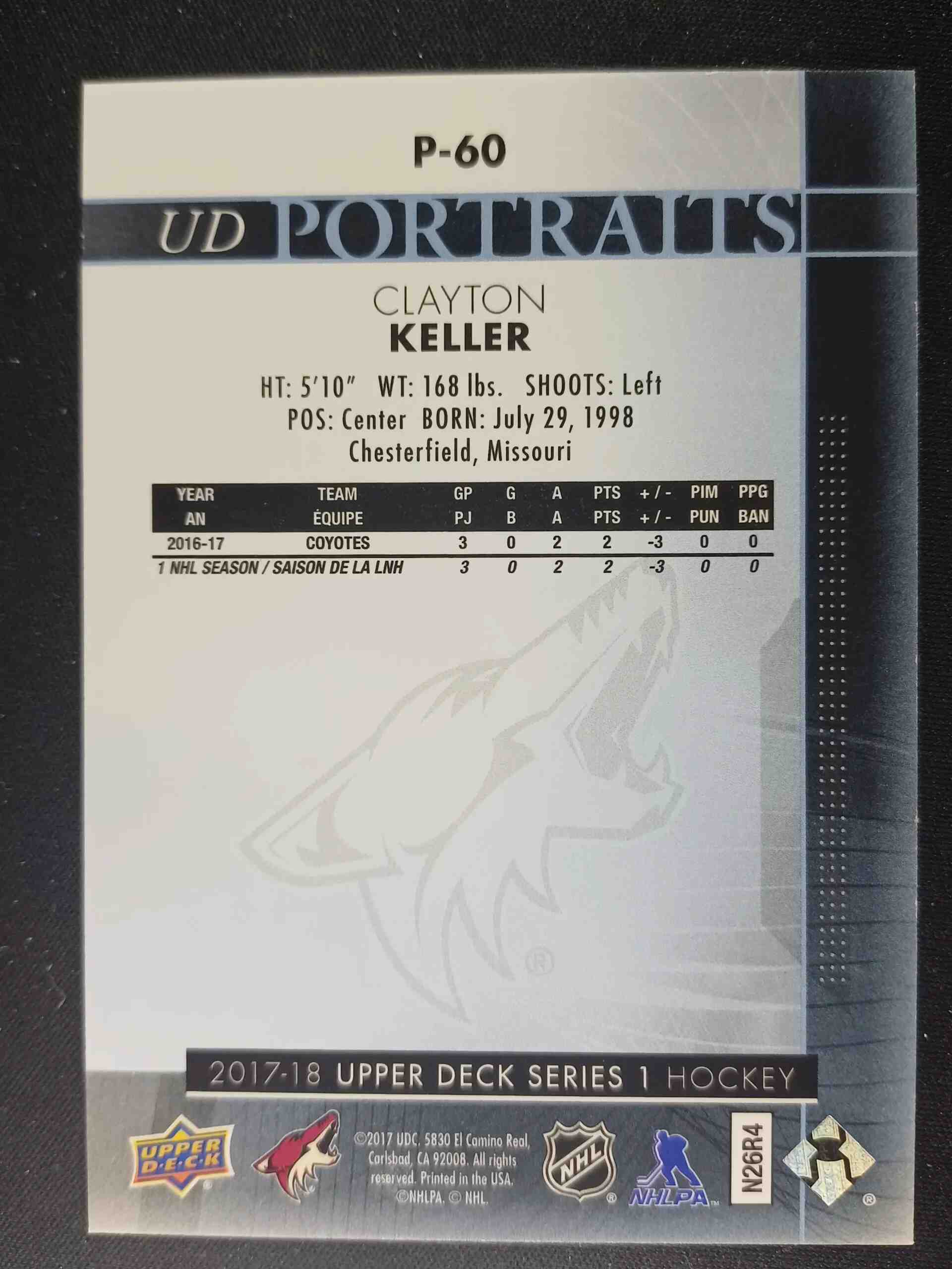 Sběratelská karta 2017/2018 Upper Deck Series 1 Portraits P-60 Clayton Keller Inzert