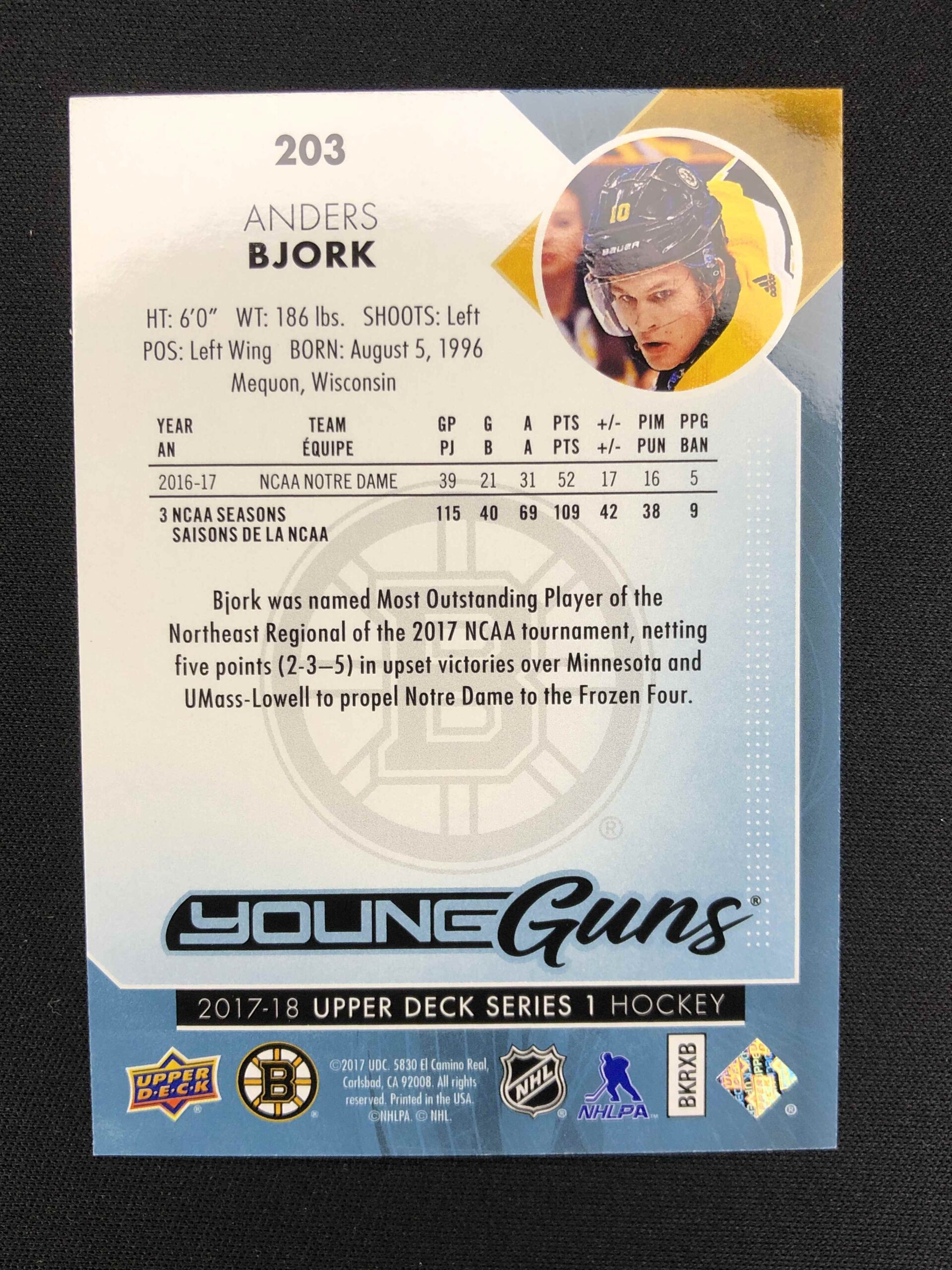 Sběratelská karta 2017/2018 Upper Deck Series 1 Young Guns 203 Anders Bjork Inzert