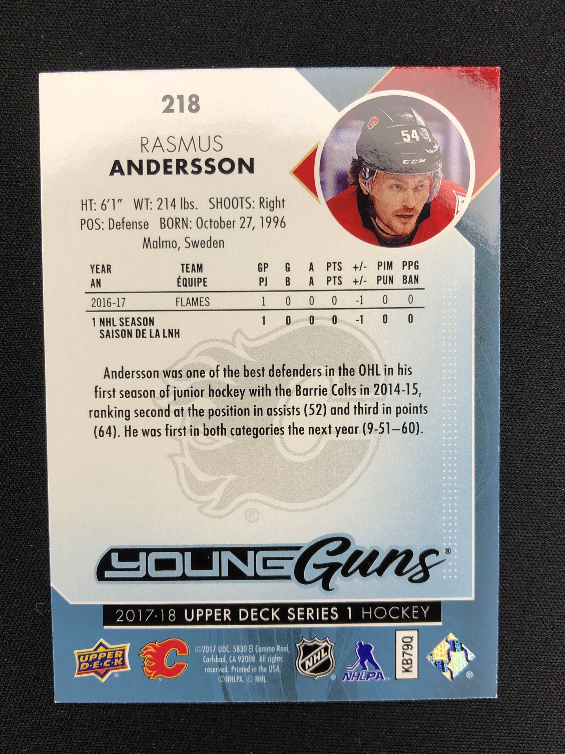 Sběratelská karta 2017/2018 Upper Deck Series 1 Young Guns 218 Rasmus Andersson Inzert