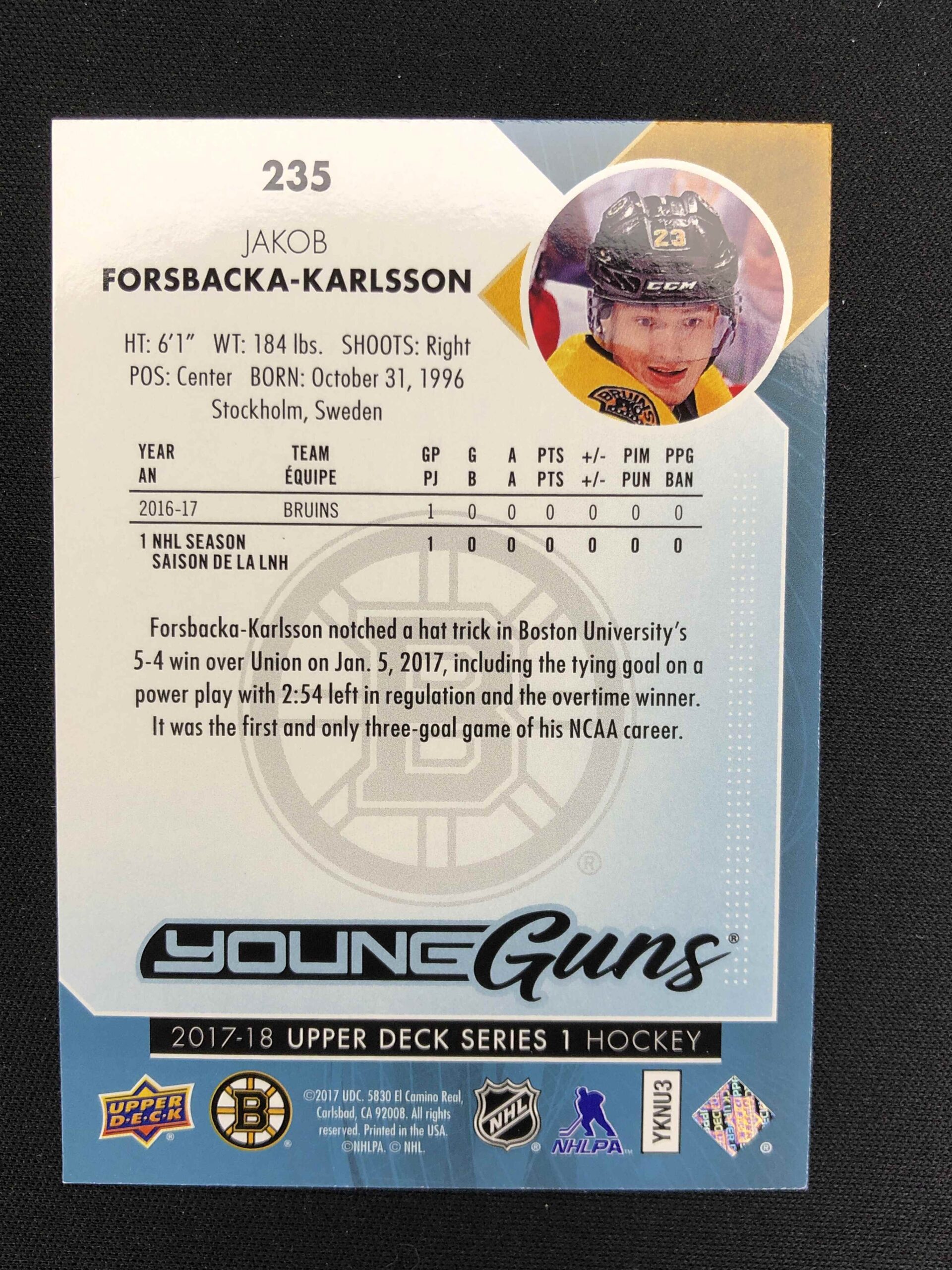 Sběratelská karta 2017/2018 Upper Deck Series 1 Young Guns 235 Jakob Forsbacka-Karlsson Inzert