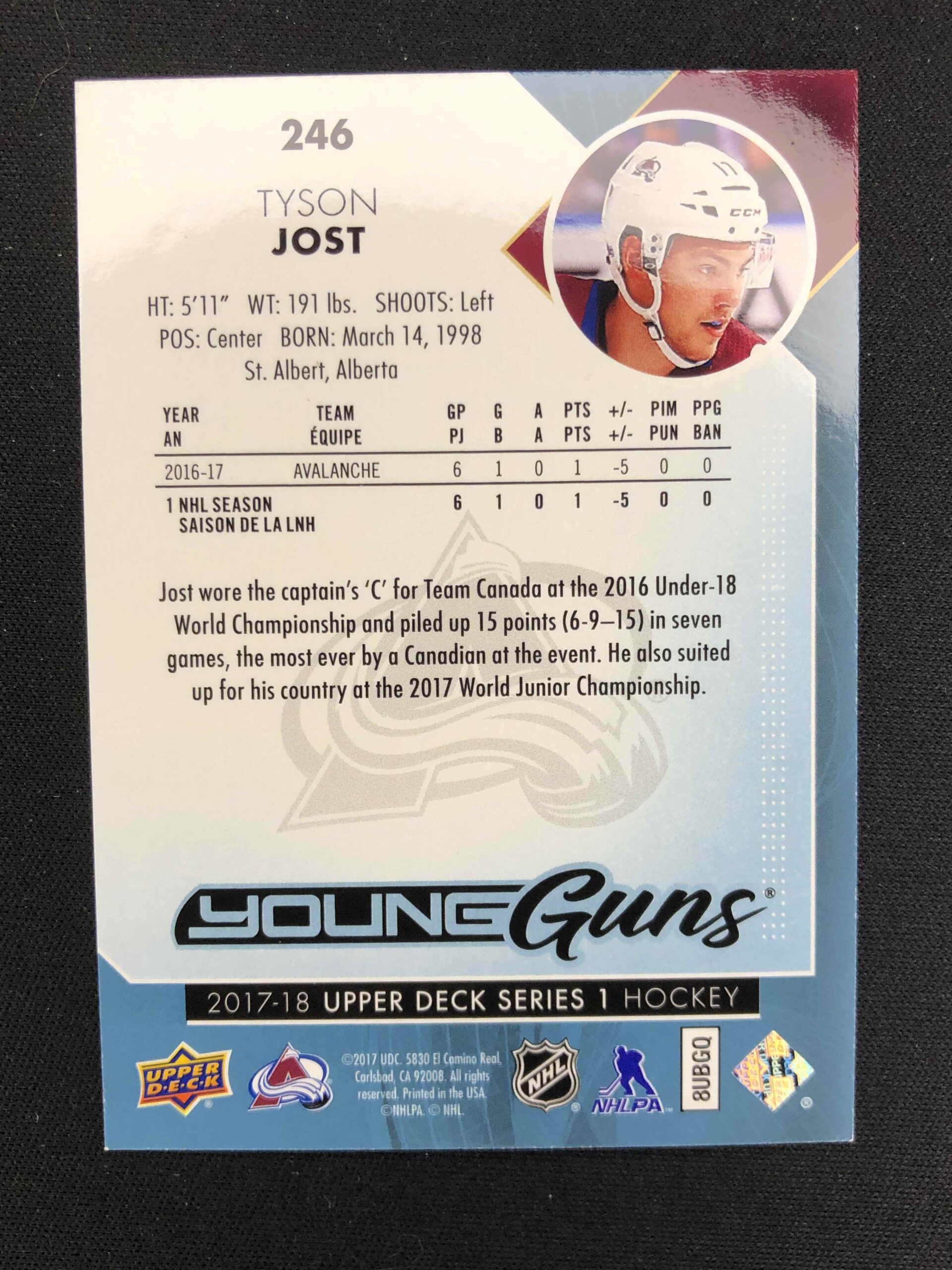Sběratelská karta 2017/2018 Upper Deck Series 1 Young Guns 246 Tyson Jost Inzert