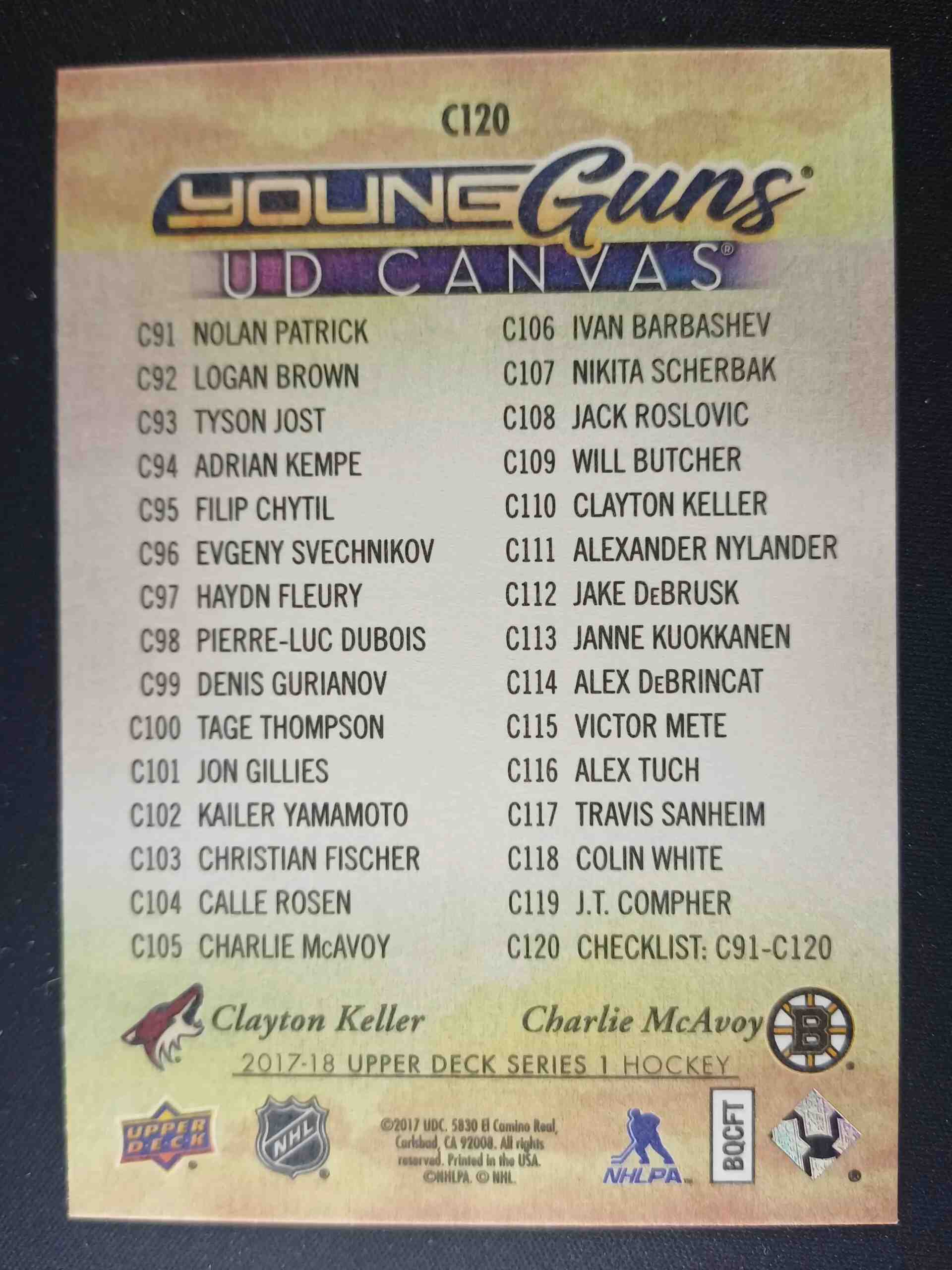 Sběratelská karta 2017/2018 Upper Deck Series 1 Young Guns Canvas Checklist C120 Clayton Keller Inzert