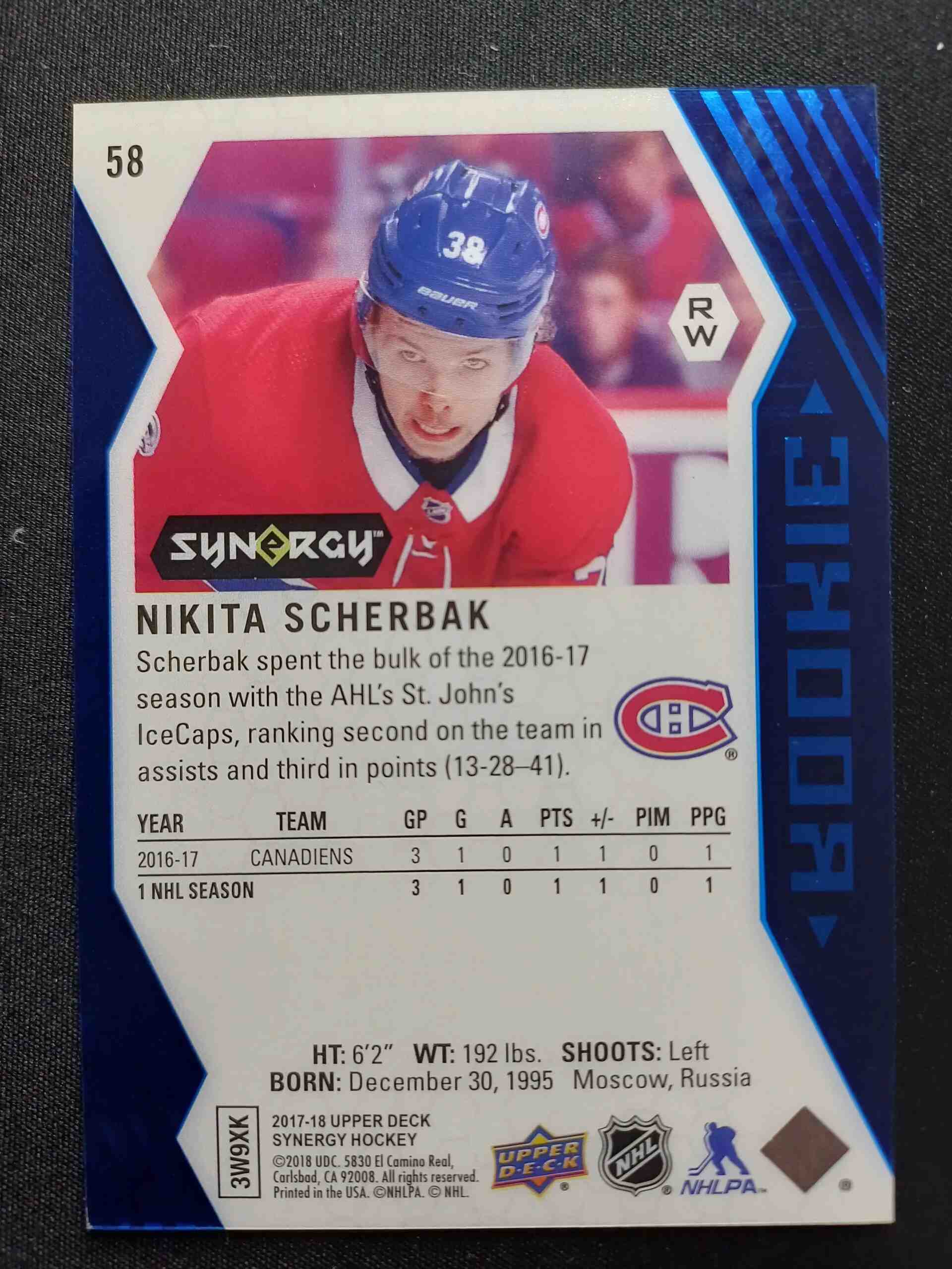 Sběratelská karta 2017/2018 Upper Deck Synergy Blue 58 Nikita Scherbak Paralel