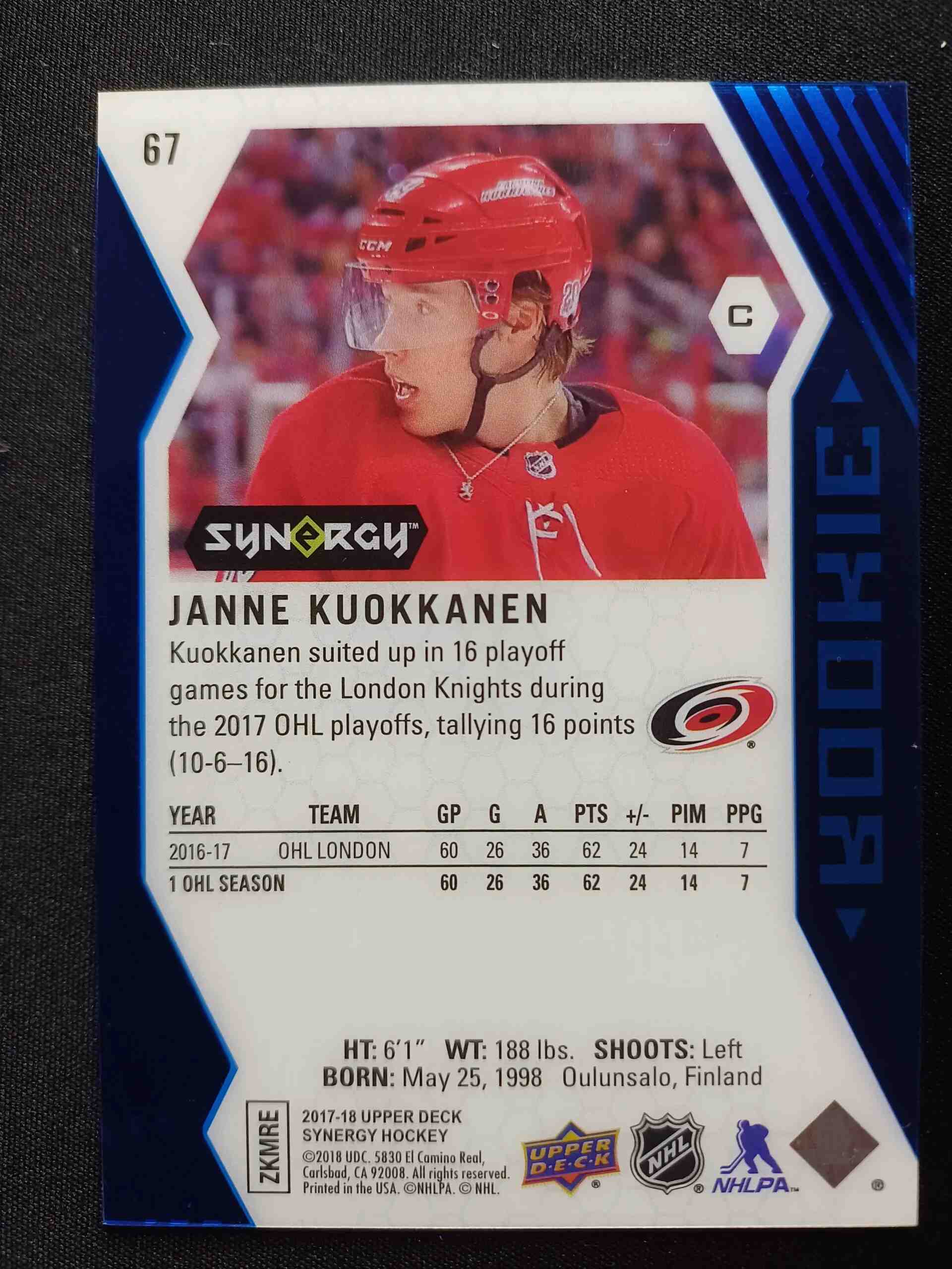 Sběratelská karta 2017/2018 Upper Deck Synergy Blue 67 Janne Kuokkanen Paralel