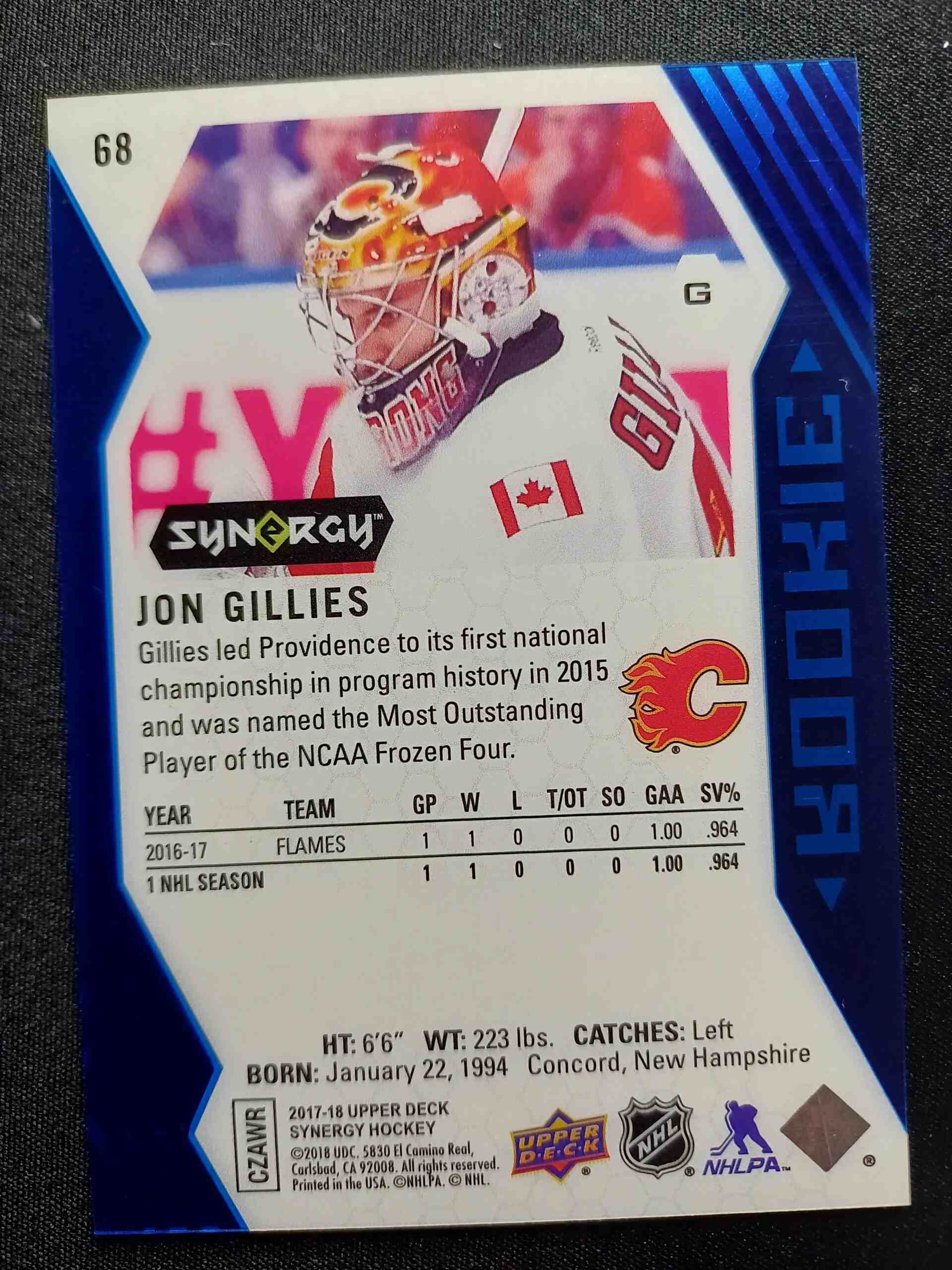 2017/2018 Upper Deck Synergy Blue 68 Jon Gillies Paralel