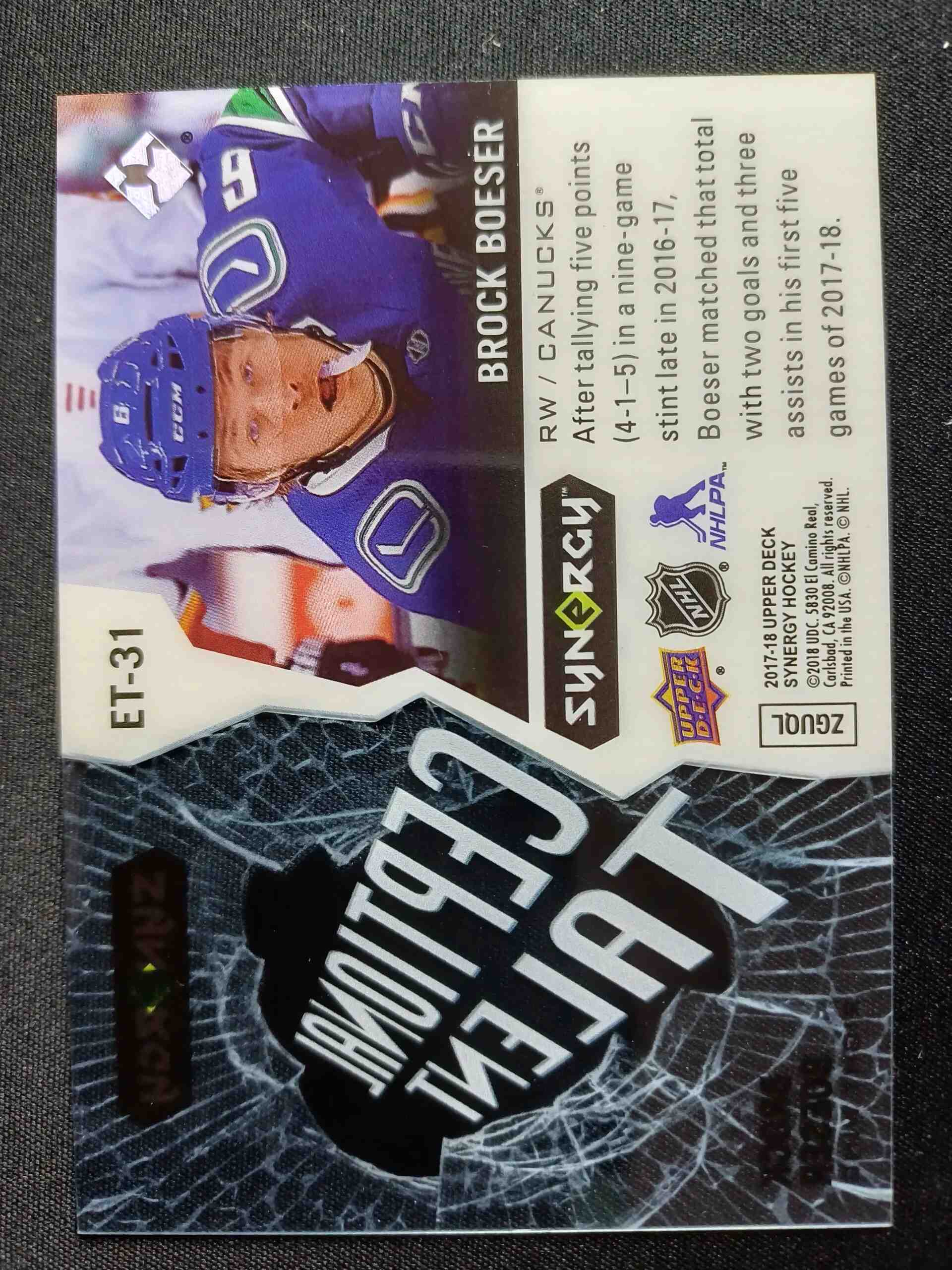 Sběratelská karta 2017/2018 Upper Deck Synergy Exceptional Talent ET-31 Brock Boeser Inzert
