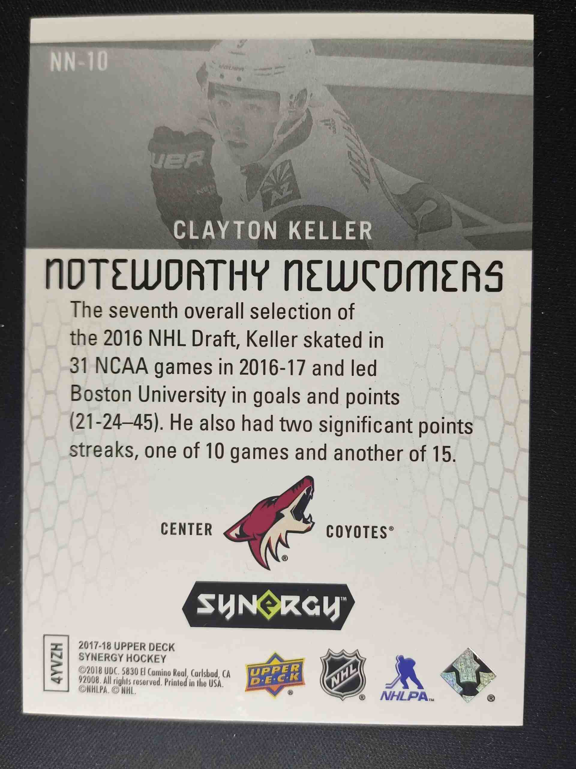 2017/2018 Upper Deck Synergy Noteworthy Newcomers NN-10 Clayton Keller Inzert