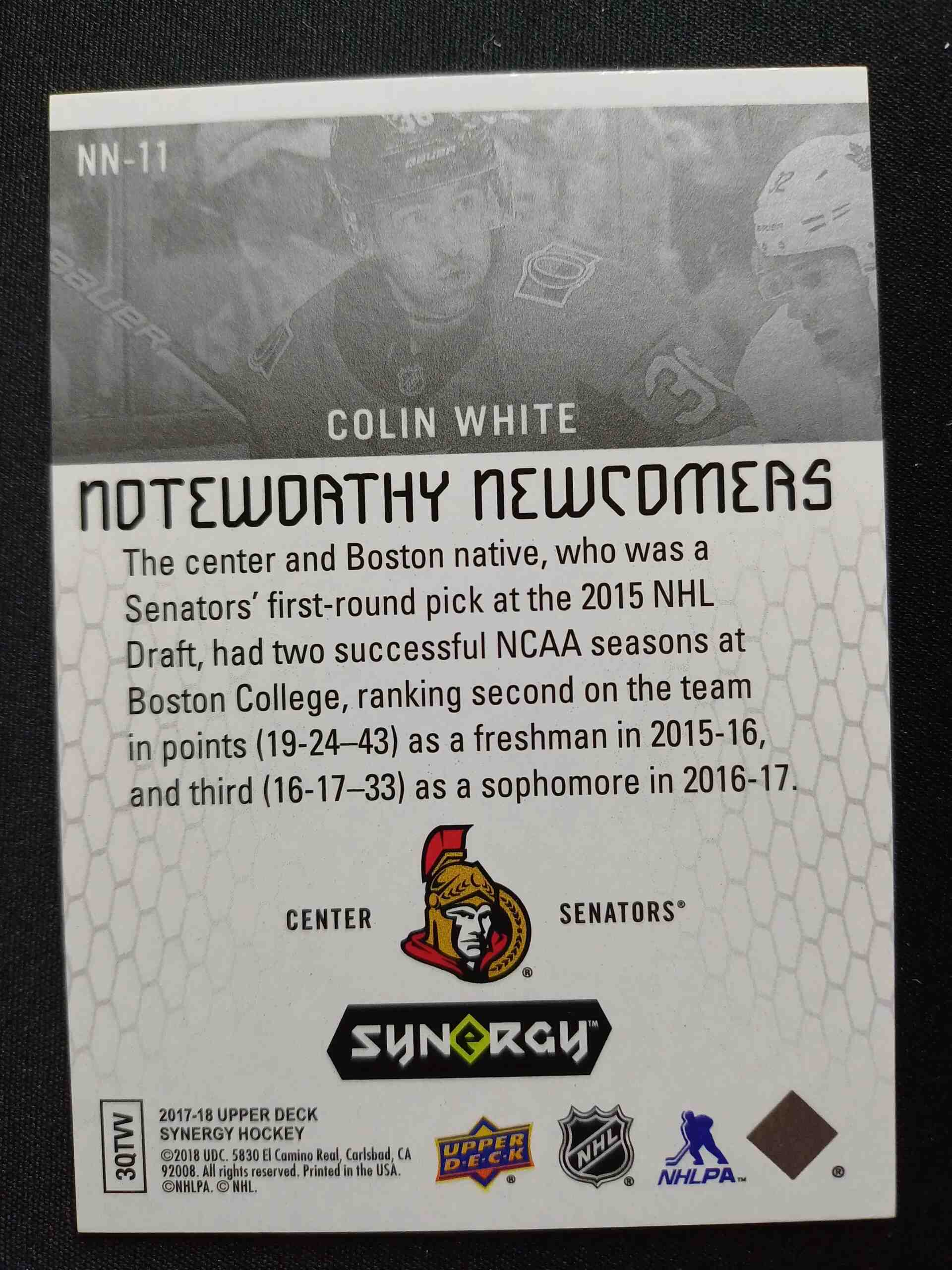 Sběratelská karta 2017/2018 Upper Deck Synergy Noteworthy Newcomers NN-11 Colin White Inzert