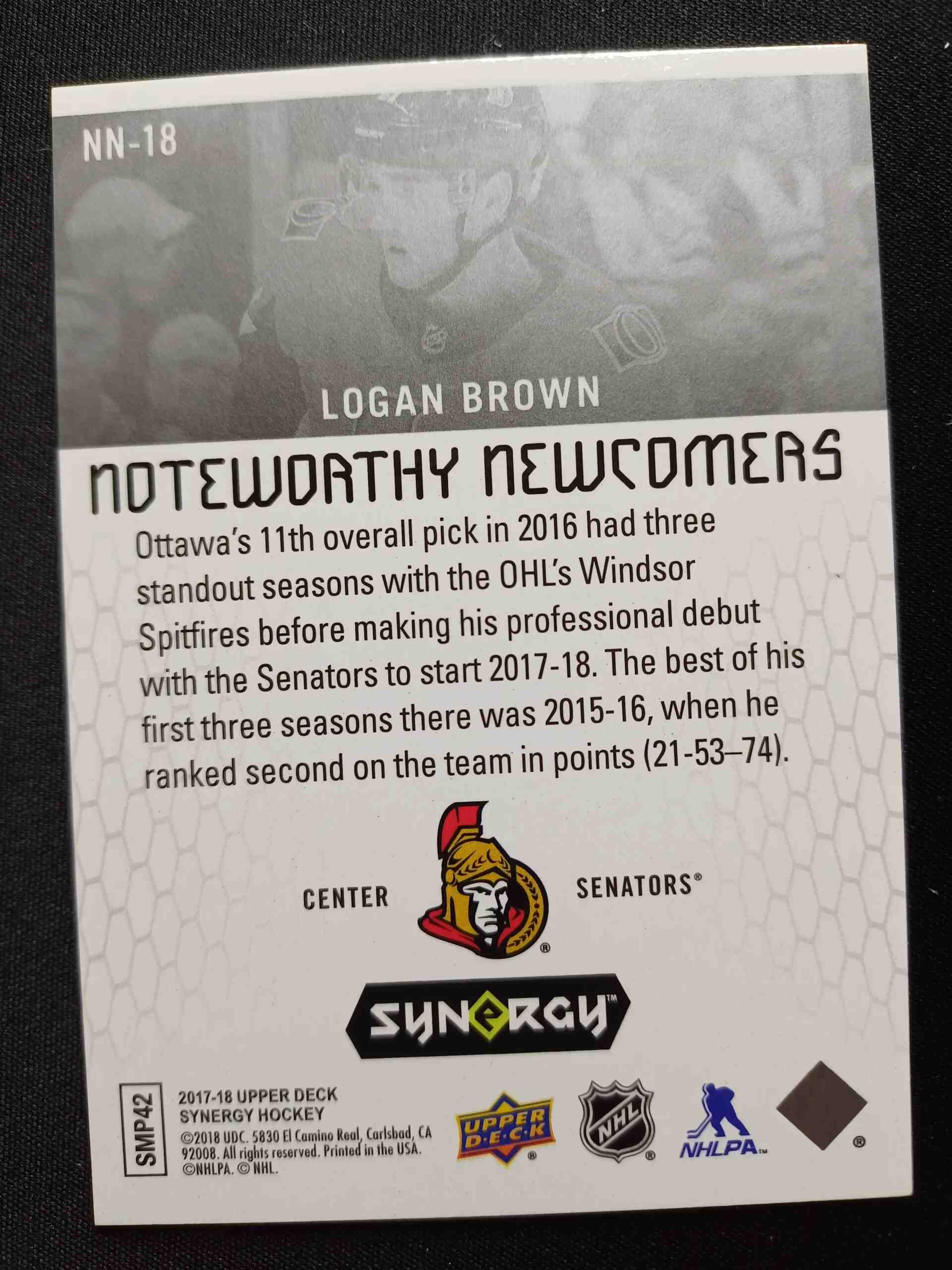 Sběratelská karta 2017/2018 Upper Deck Synergy Noteworthy Newcomers NN-18 Logan Brown Inzert