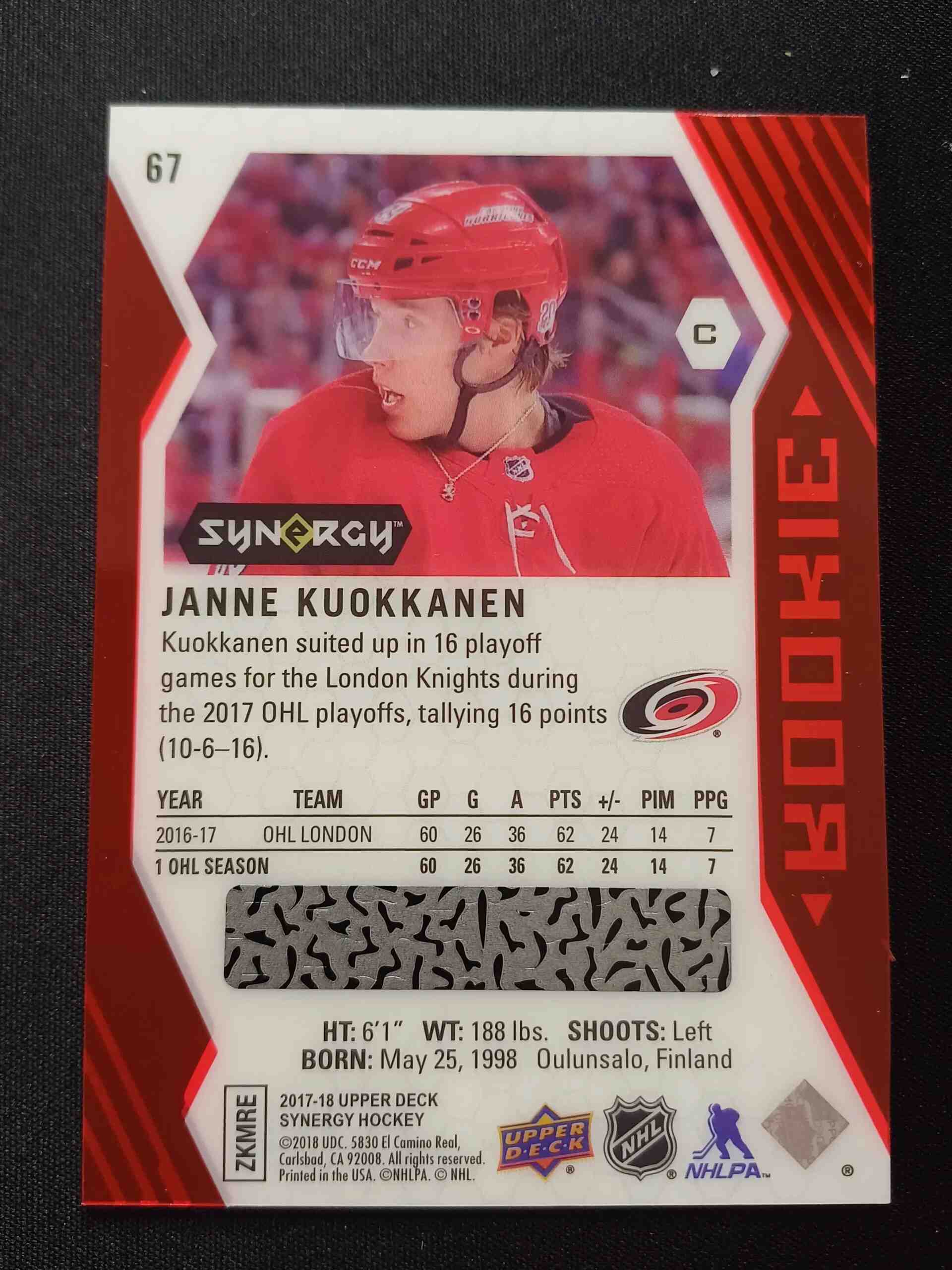 Sběratelská karta 2017/2018 Upper Deck Synergy Red Bounty 67 Janne Kuokkanen Paralel