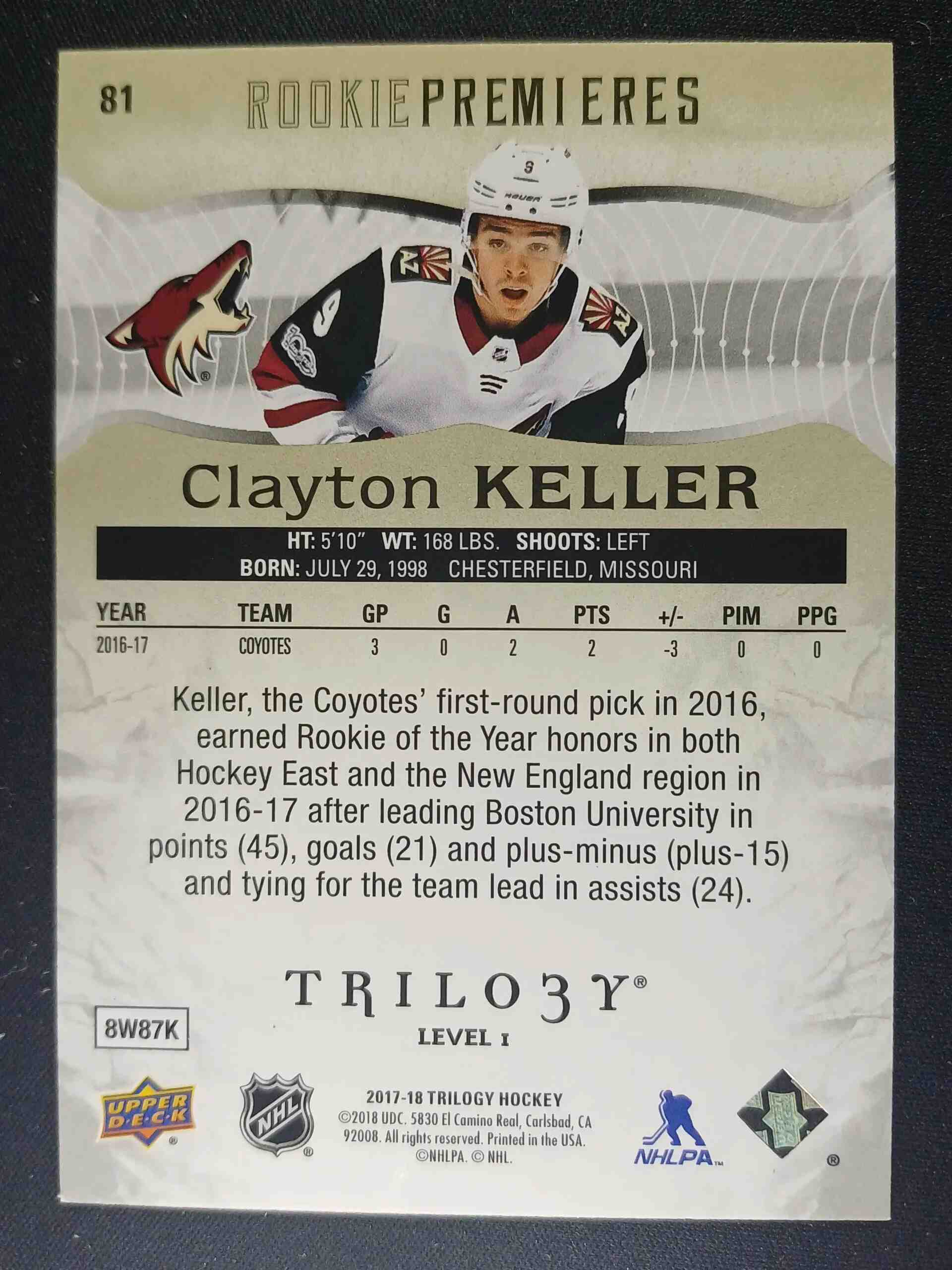 2017/2018 Upper Deck Trilogy Level 1 Rookie Premieres 81 Clayton Keller Inzert 489/999