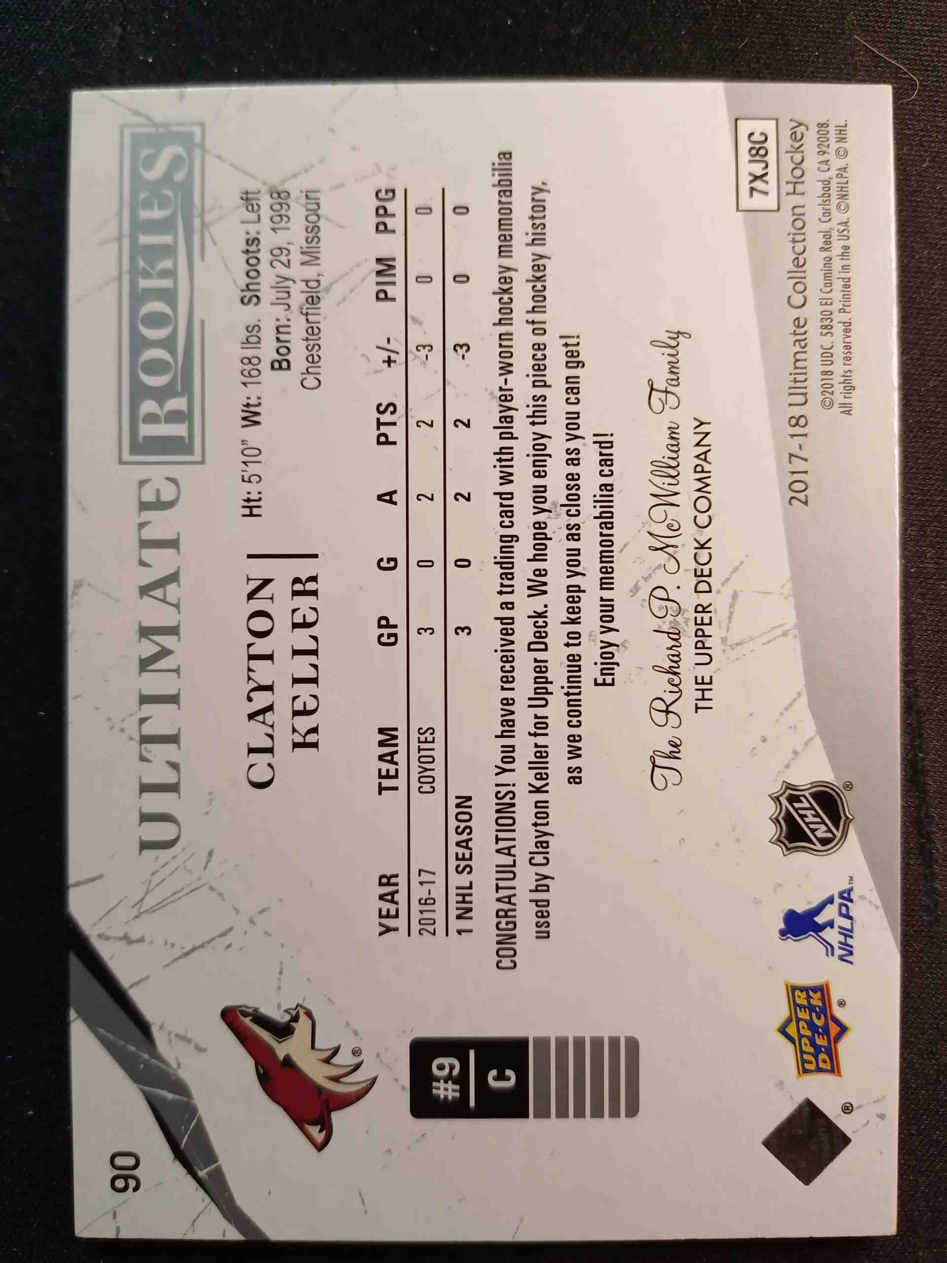 Sběratelská karta 2017/2018 Upper Deck Ultimate Collection Ultimate Rookies 90 Clayton Keller Jersey 279/299