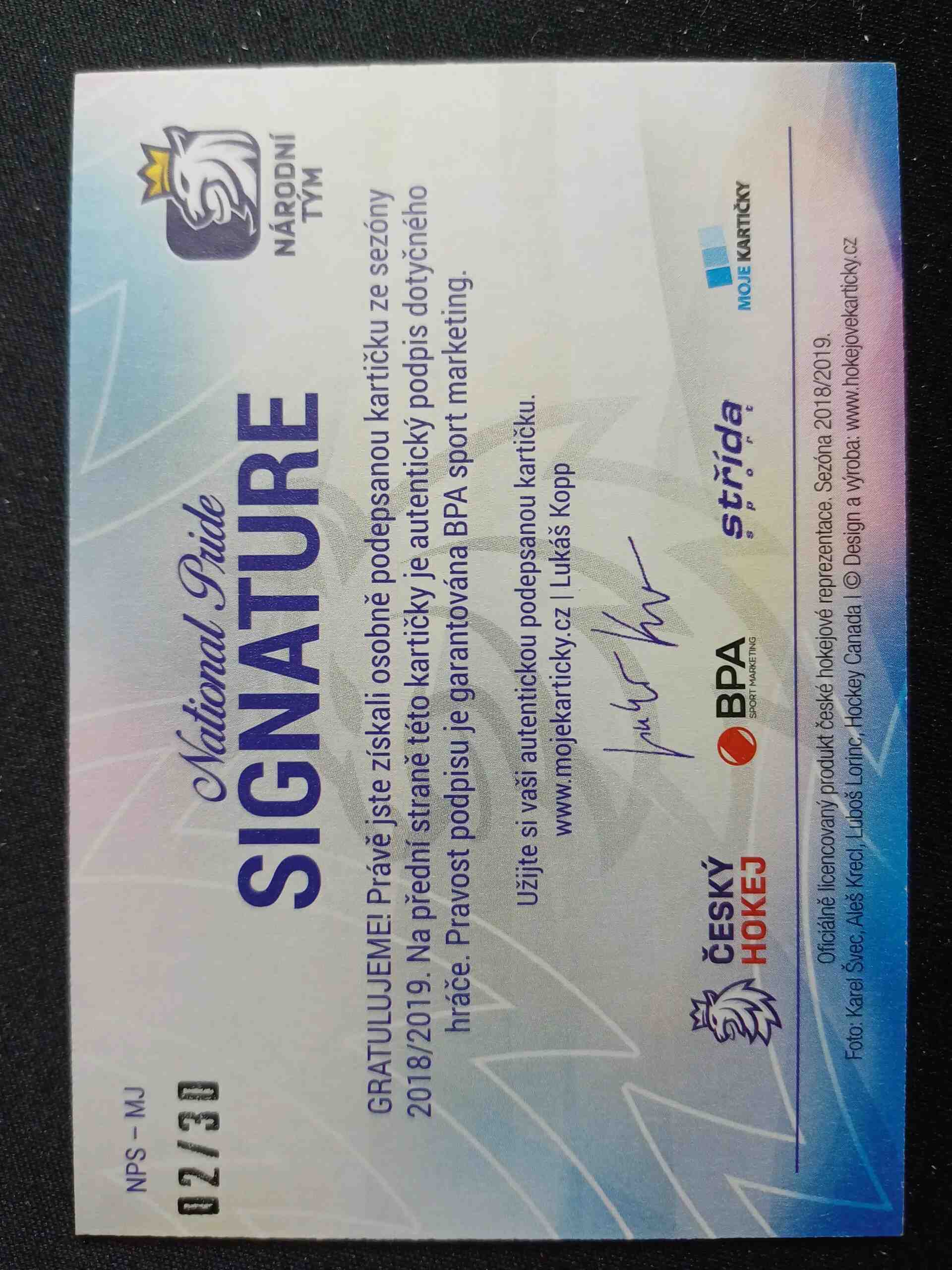 Sběratelská karta 2018/2019 Moje Kartičky Národní Tým National Pride NPS-MJ Jan Mysak AUTO 02/30
