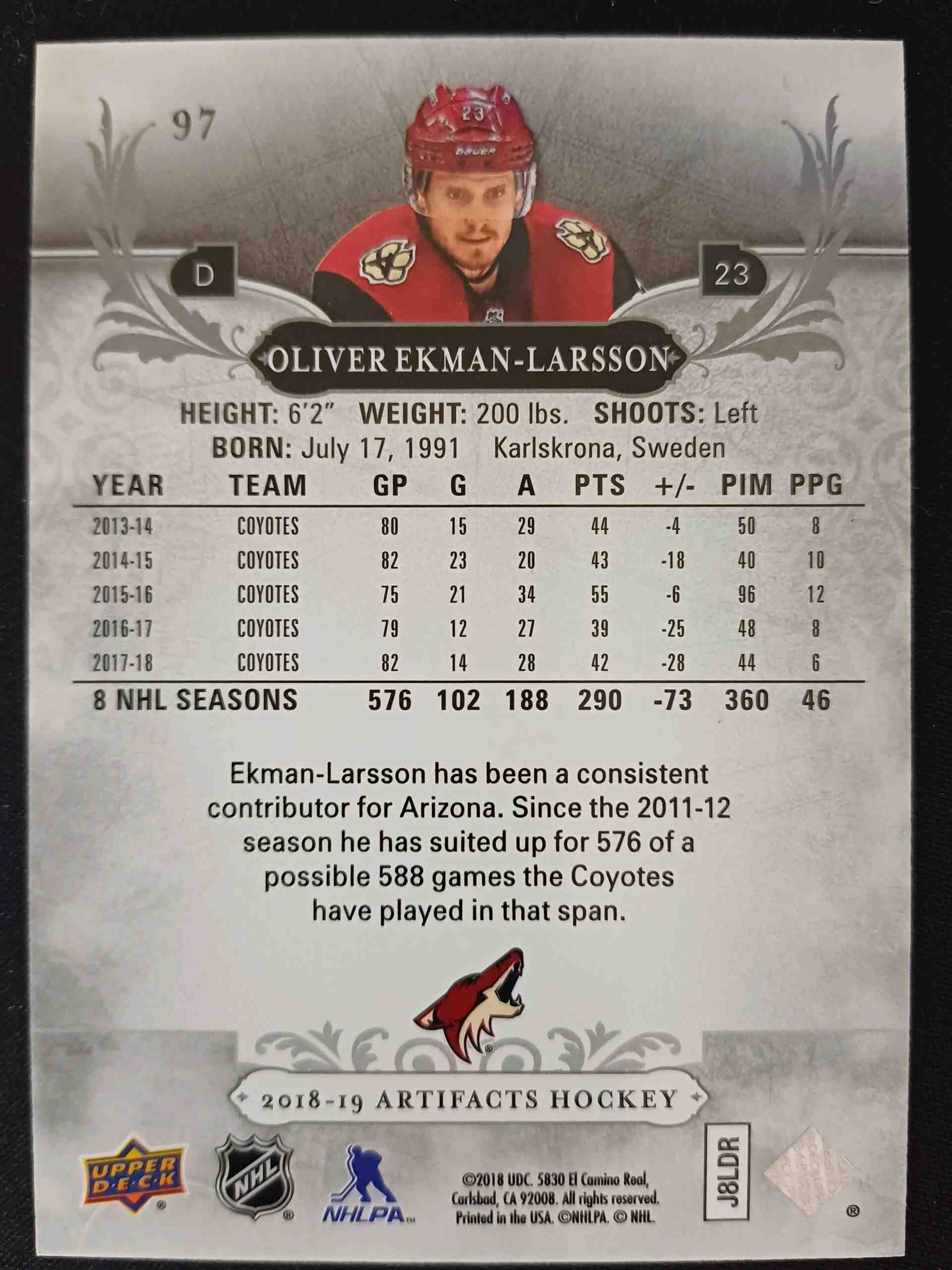 2018/2019 Upper Deck Artifacts Aqua 97 Oliver Ekman-Larsson Paralel 44/45