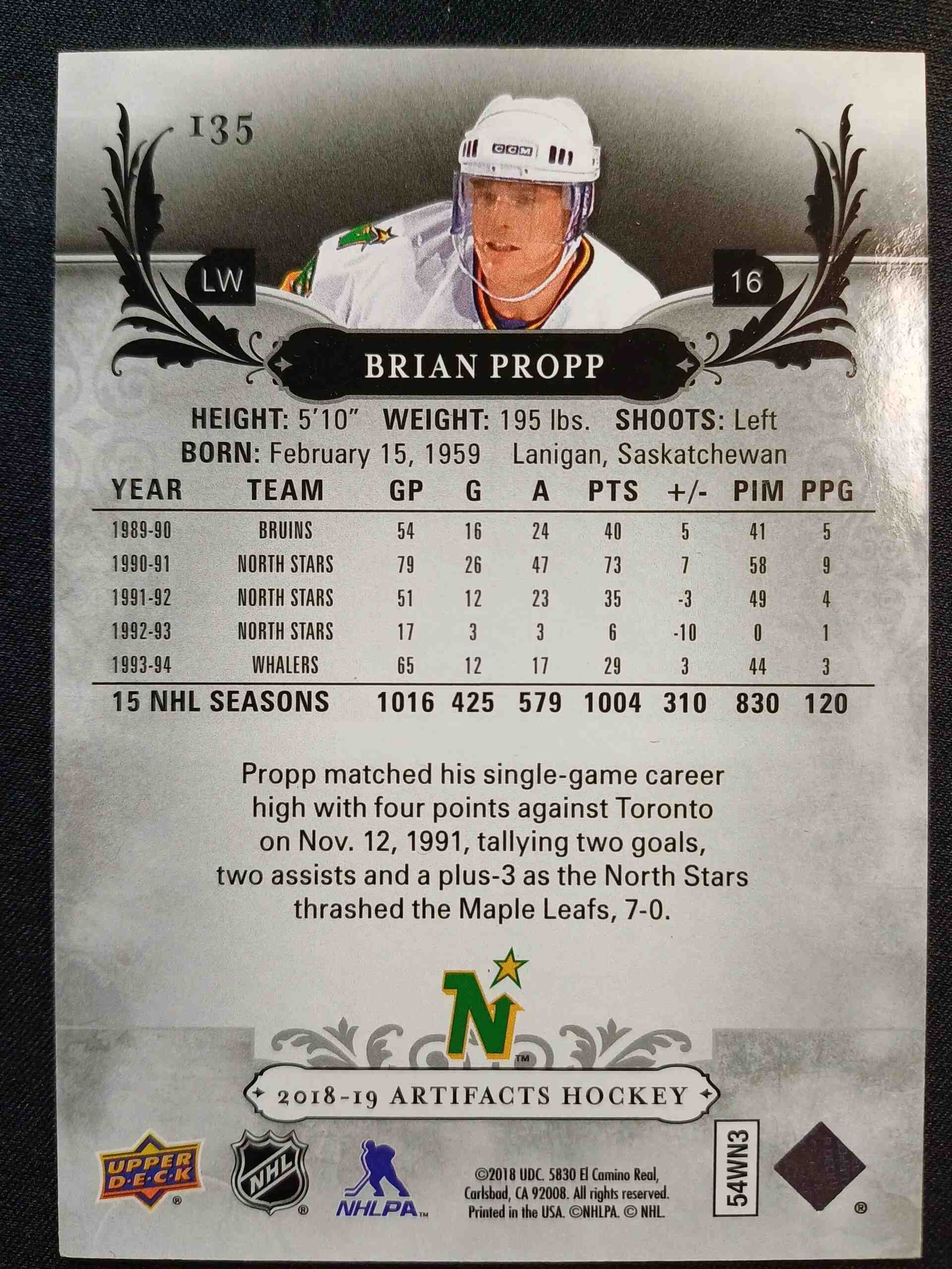 Sběratelská karta 2018/2019 Upper Deck Artifacts Base 135 Brian Propp 301/599