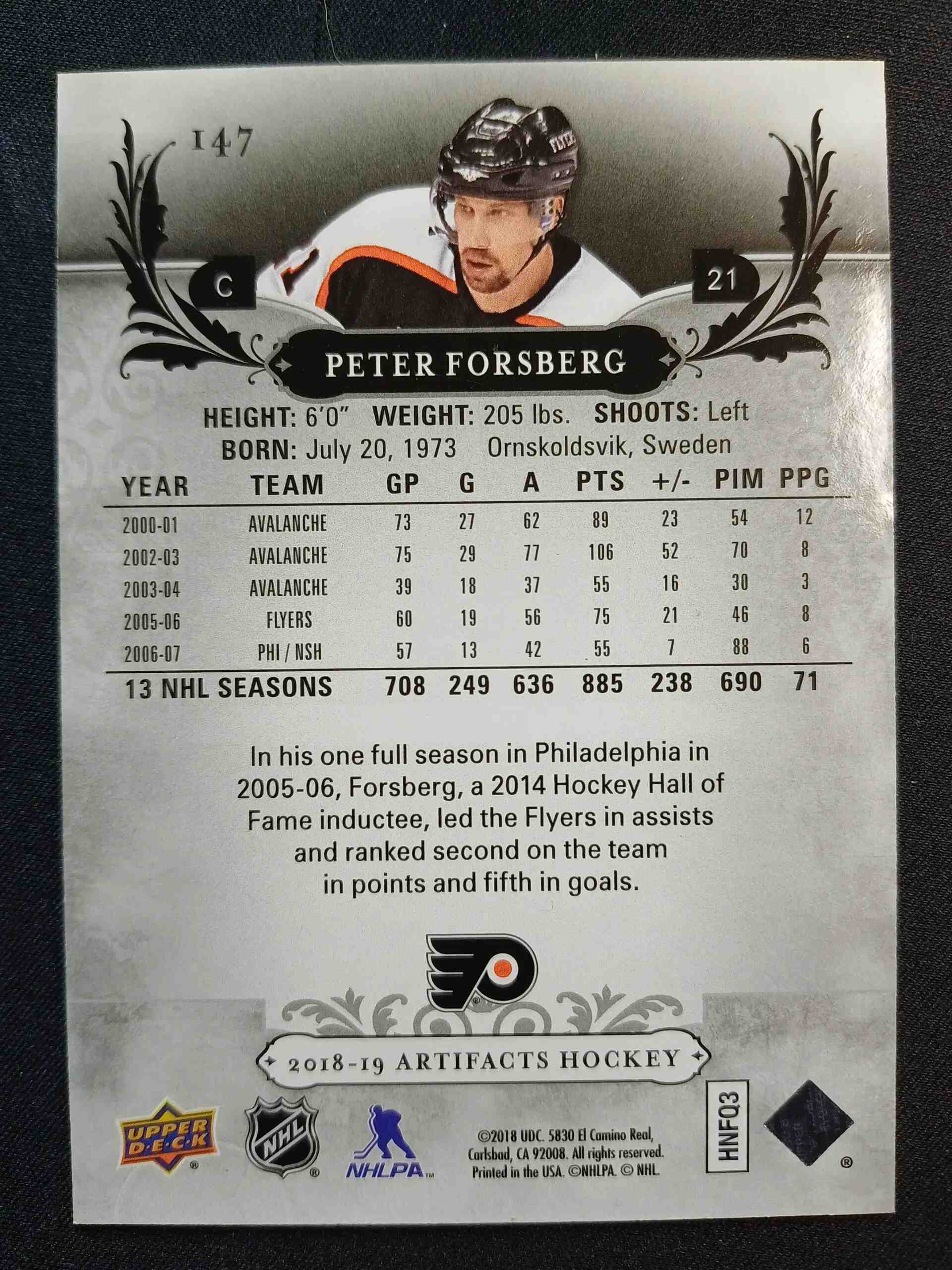 Sběratelská karta 2018/2019 Upper Deck Artifacts Base 147 Peter Forsberg 344/599 /n/ Stav karty je NM-MT /n/ Pro bližší detail si prohlédněte přiložené fotografie