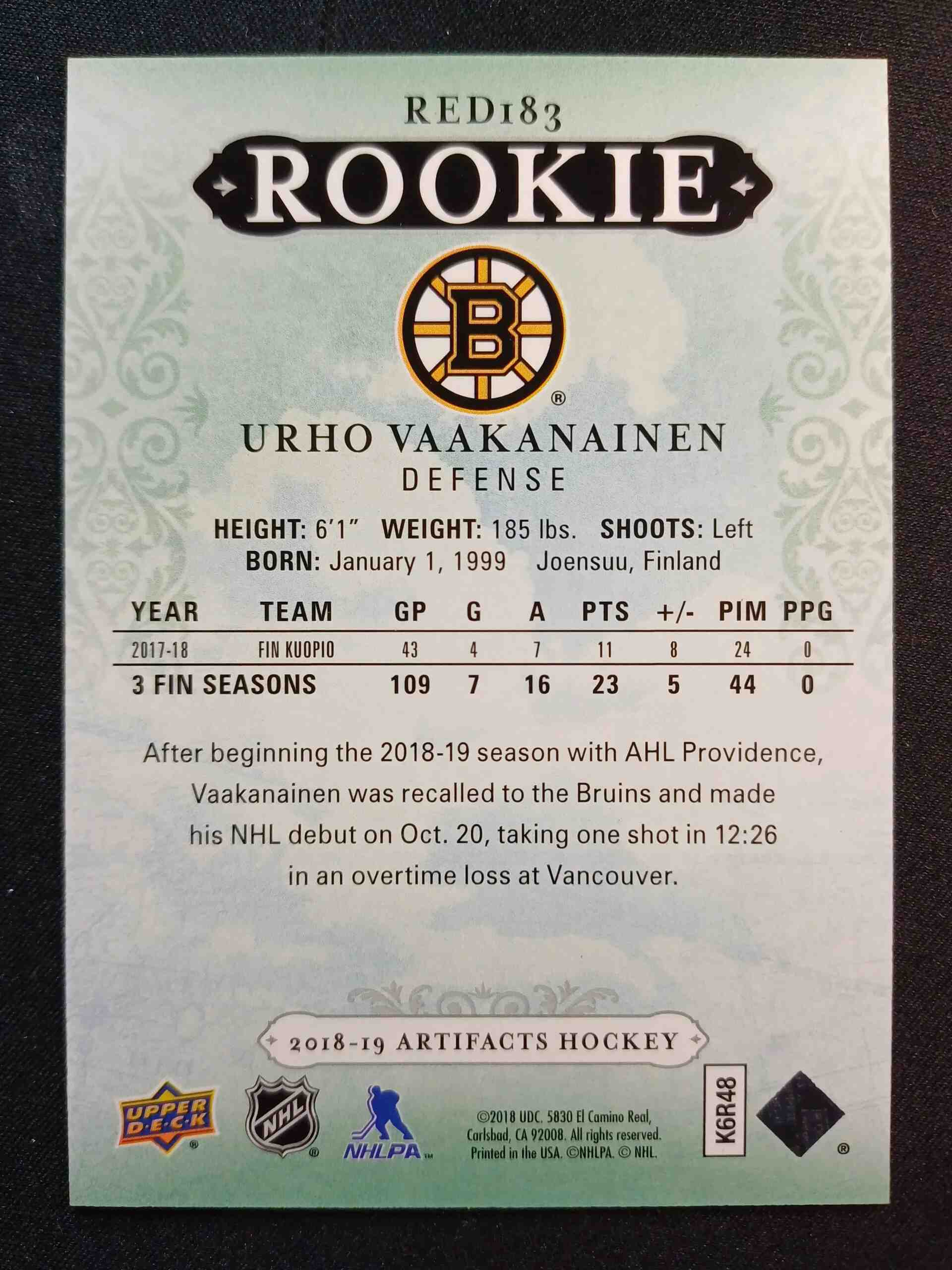 Sběratelská karta 2018/2019 Upper Deck Artifacts Base RED183 Urho Vaakavainen 744/799 /n/ Stav karty je NM-MT /n/ Pro bližší detail si prohlédněte přiložené fotografie