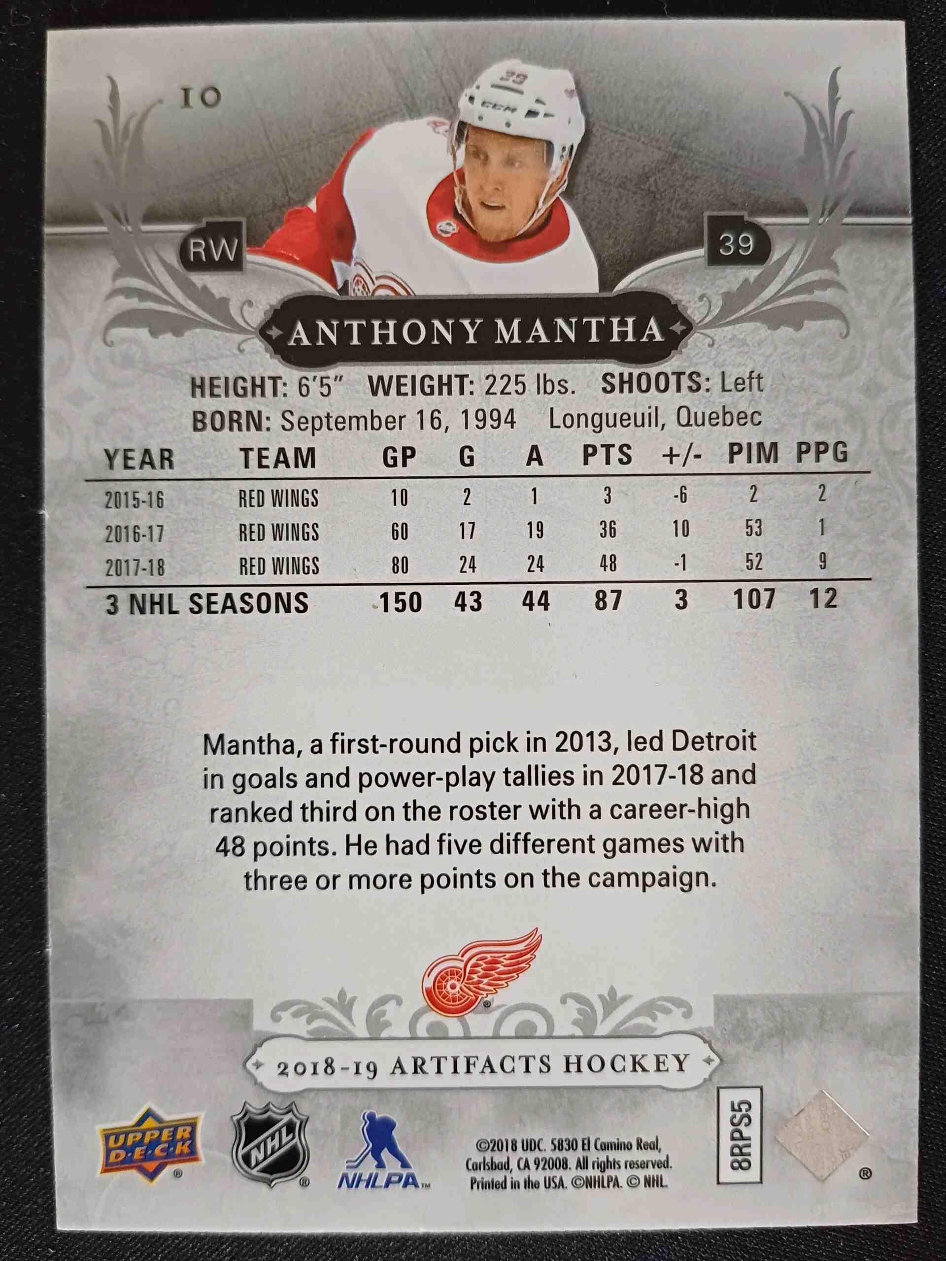 Sběratelská karta 2018/2019 Upper Deck Artifacts Emerald 10 Anthony Mantha Paralel 92/99