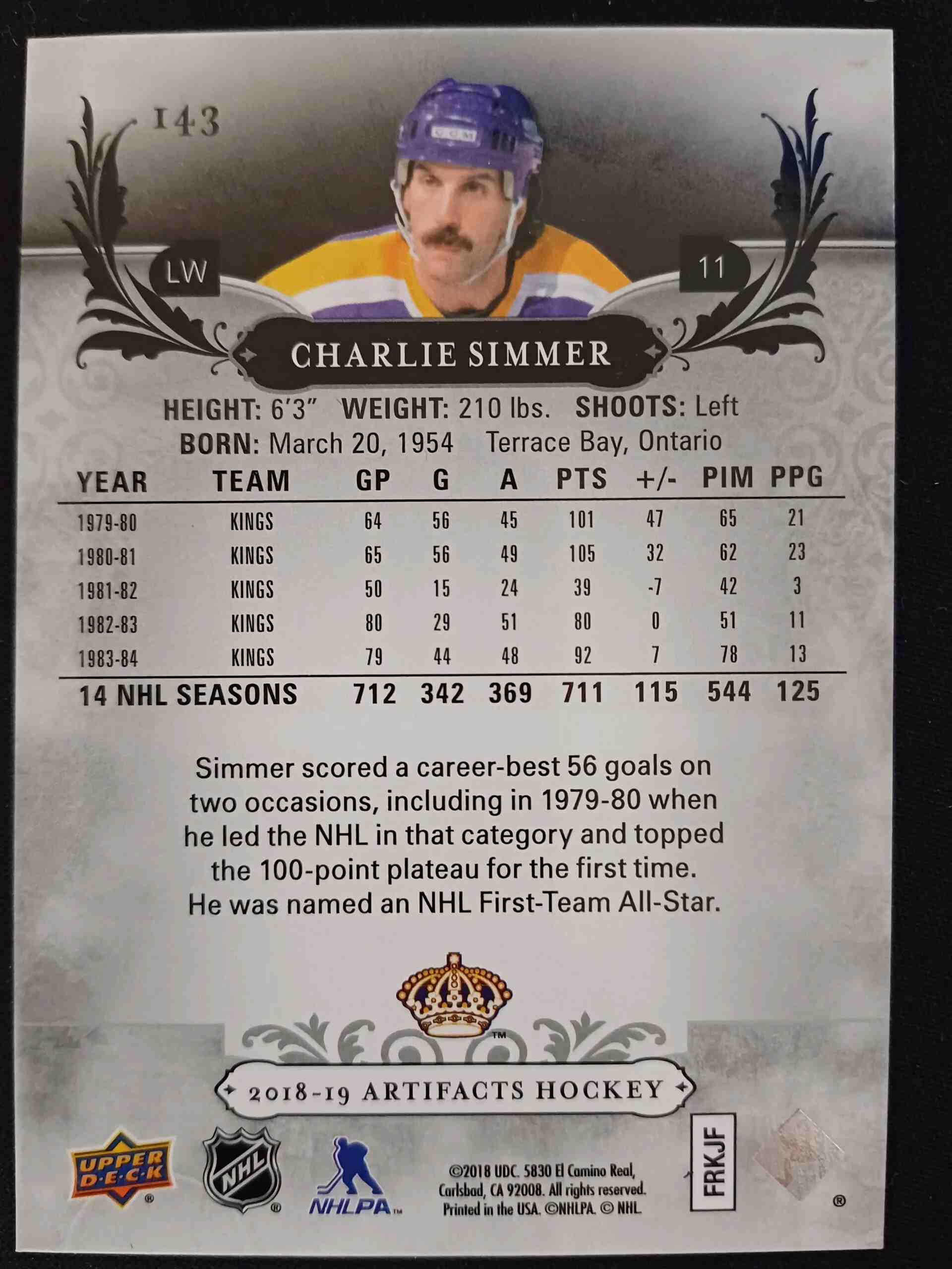Sběratelská karta 2018/2019 Upper Deck Artifacts Purple 143 Charlie Simmer Paralel 09/20
