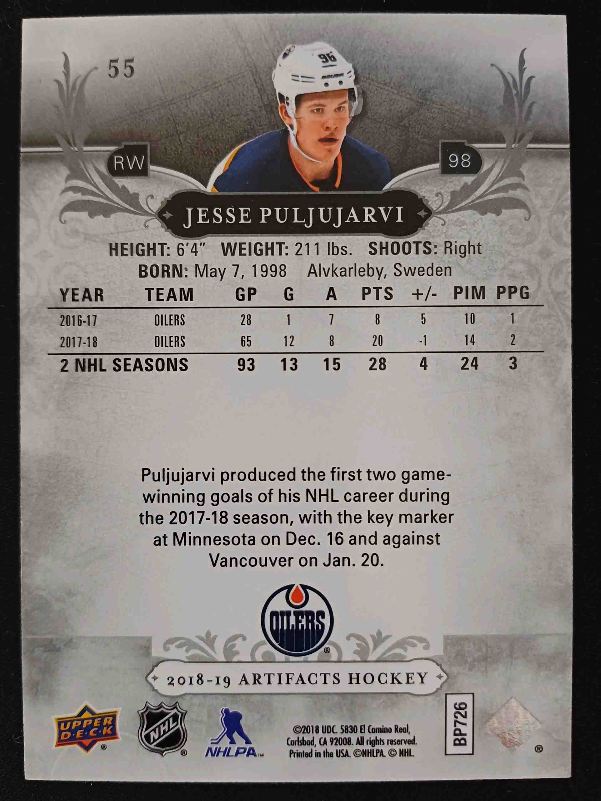 Sběratelská karta 2018/2019 Upper Deck Artifacts Purple 55 Jesse Puljujarvi Paralel 16/20