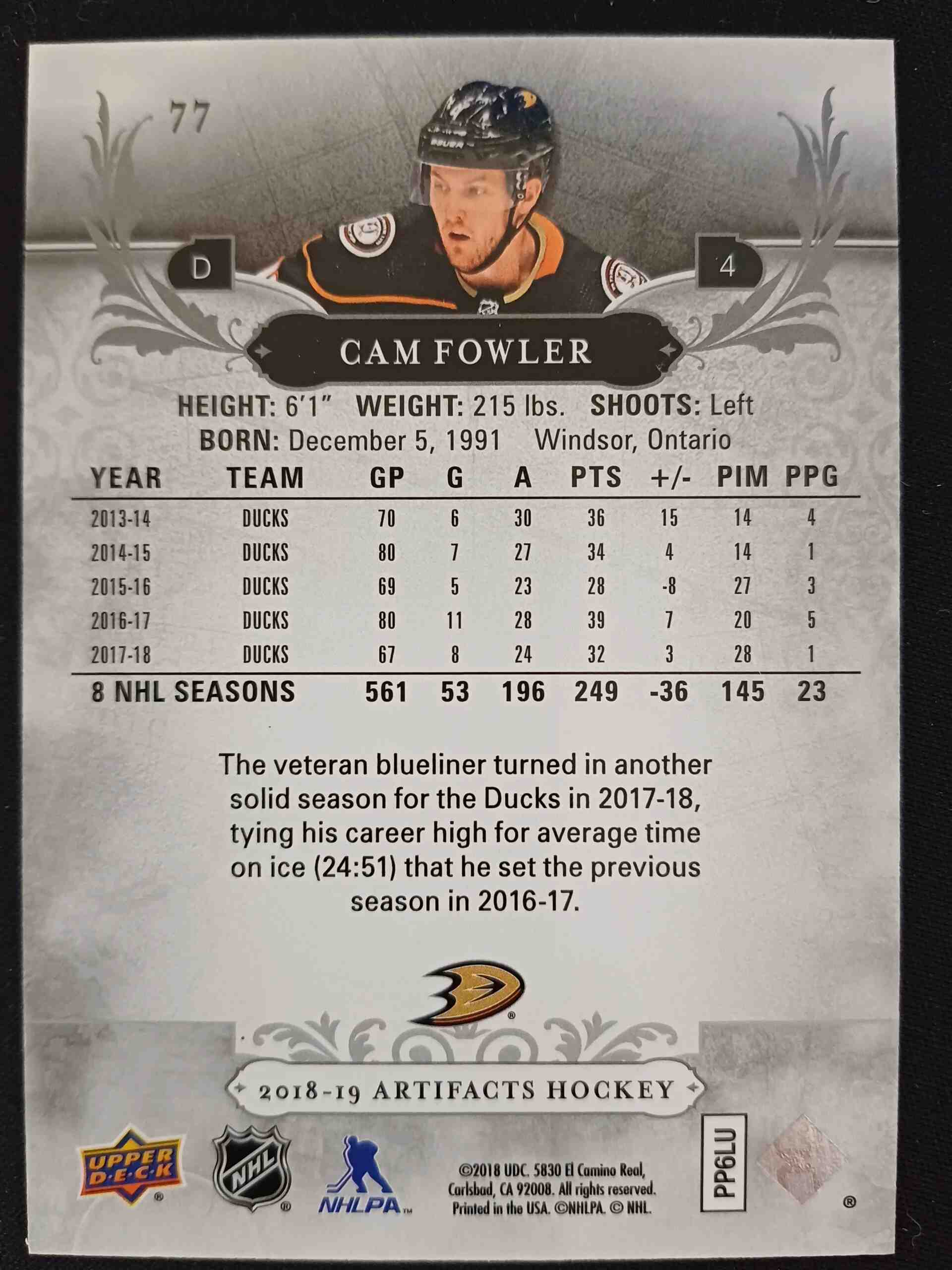 Sběratelská karta 2018/2019 Upper Deck Artifacts Purple 77 Cam Fowler Paralel 13/20