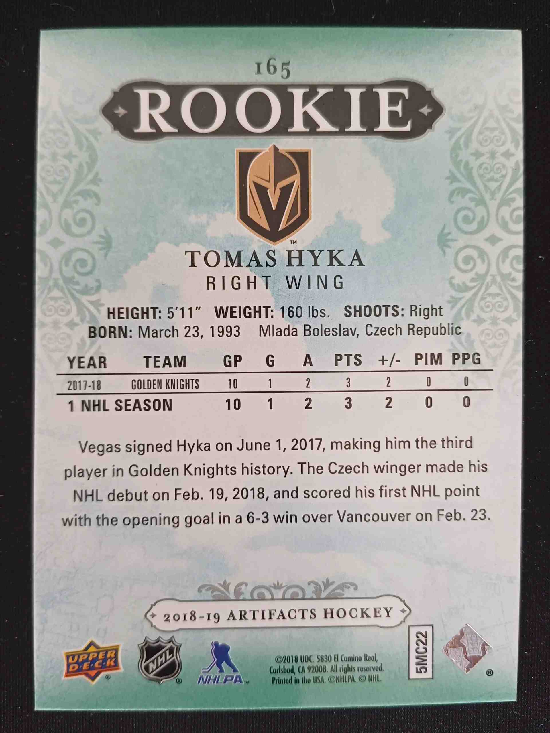 Sběratelská karta 2018/2019 Upper Deck Artifacts Purple Rookie 165 Tomas Hyka Paralel 02/20