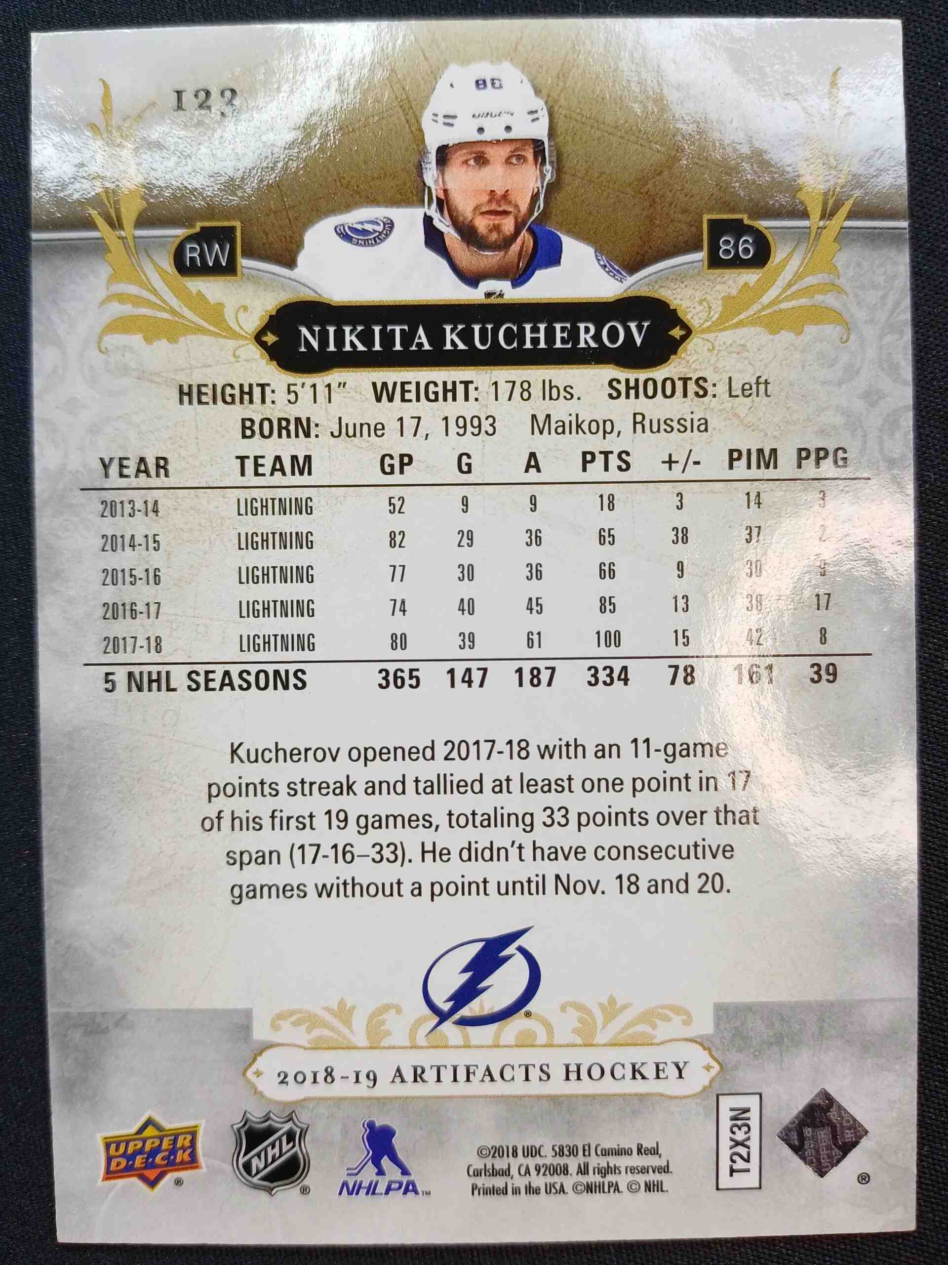 Sběratelská karta 2018/2019 Upper Deck Artifacts Ruby 123 Nikita Kucherov Paralel 015/349