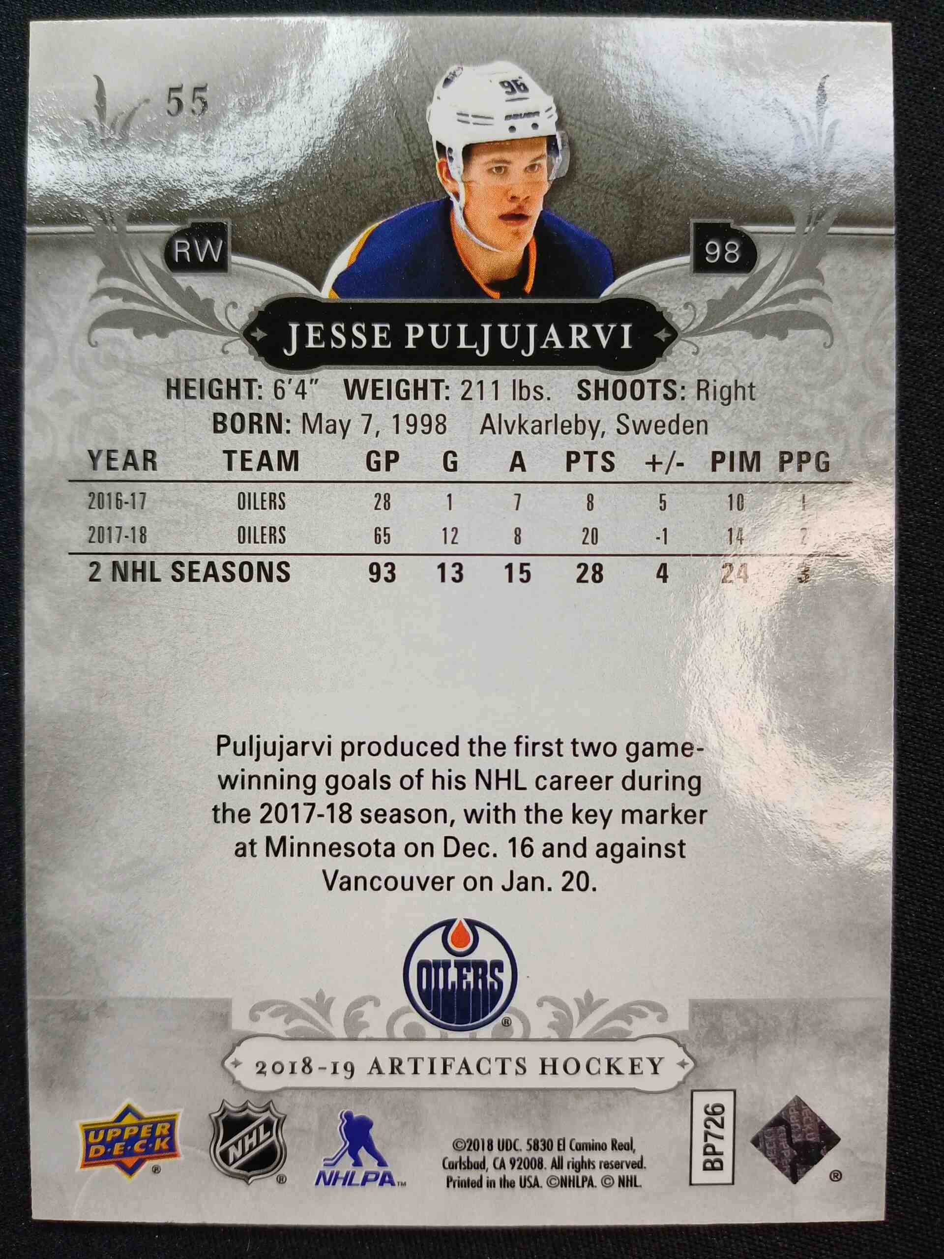 Sběratelská karta 2018/2019 Upper Deck Artifacts Ruby 55 Jesse Puljujarvi Paralel 279/299