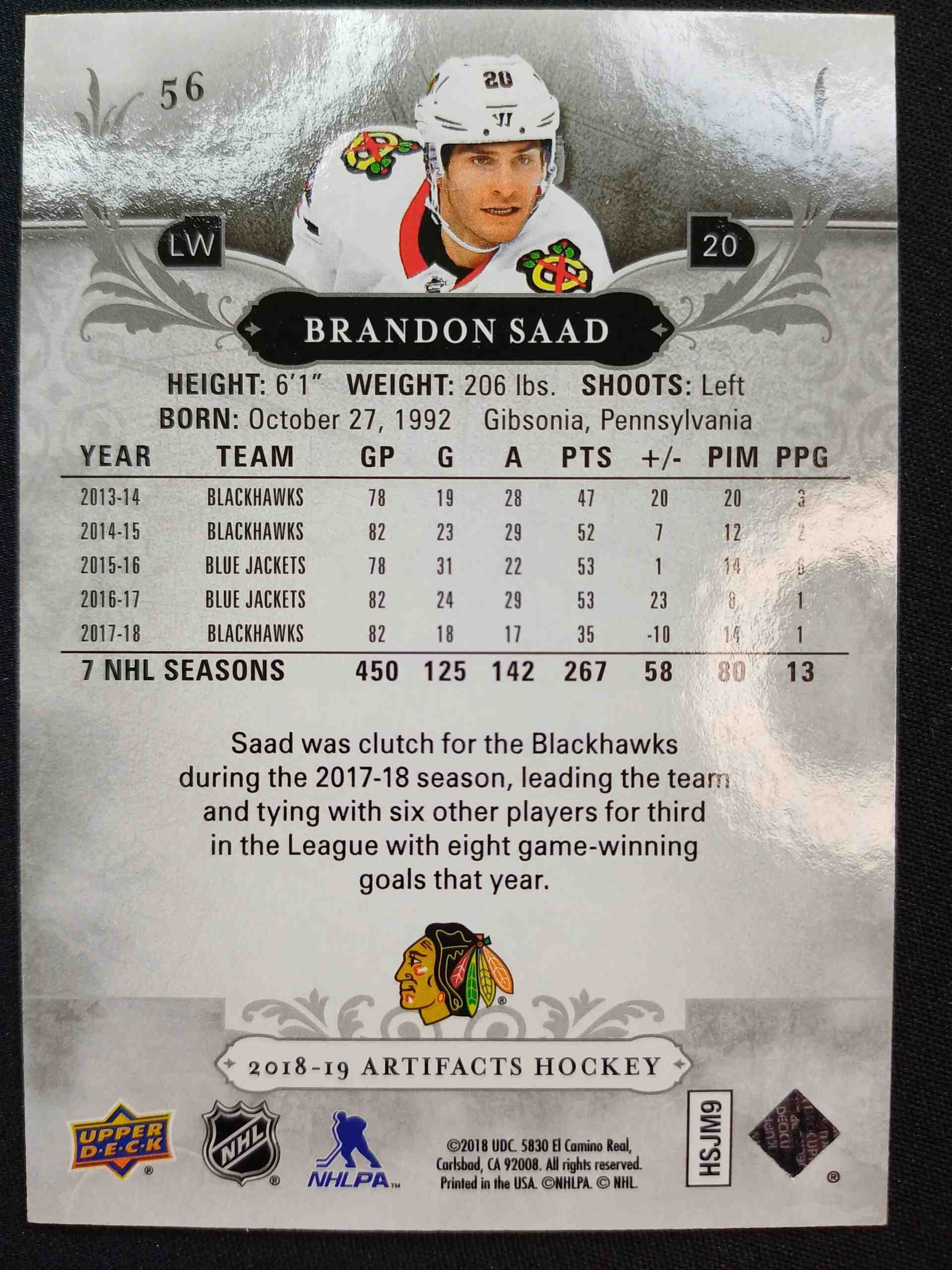 2018/2019 Upper Deck Artifacts Ruby 56 Brandon Saad Paralel 046/299