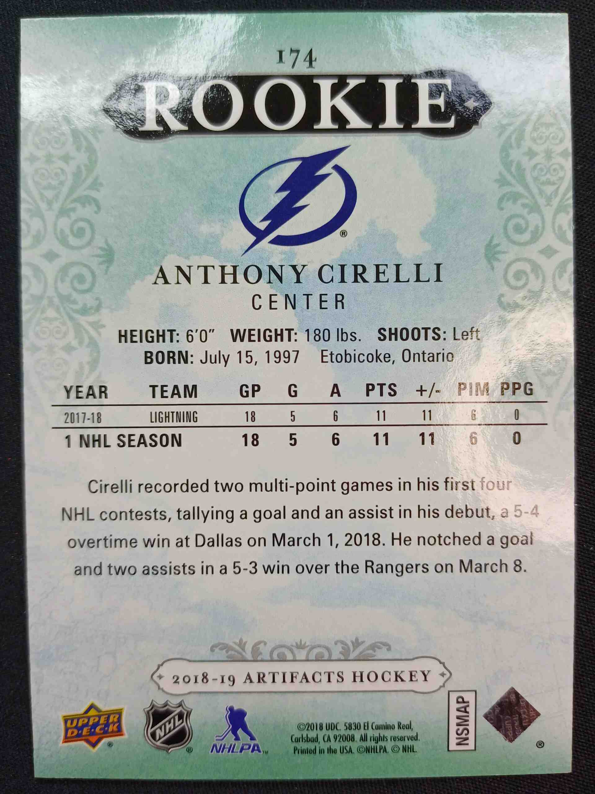 Sběratelská karta 2018/2019 Upper Deck Artifacts Ruby Rookie 174 Anthony Cirelli Paralel 182/399