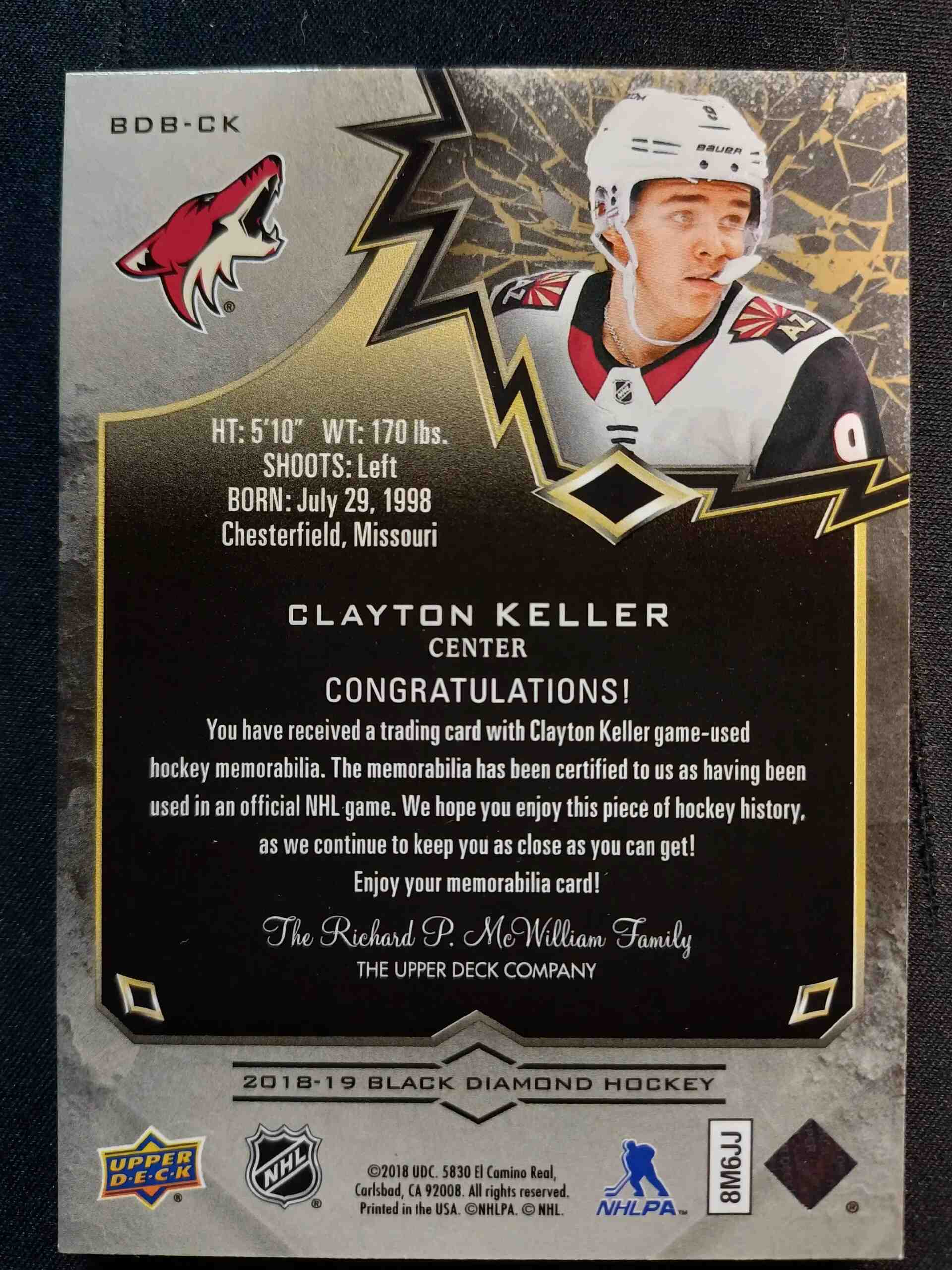 Sběratelská karta 2018/2019 Upper Deck Black Diamond Pure Black Premium Relics BDB-CK Clayton Keller Patch 35/50