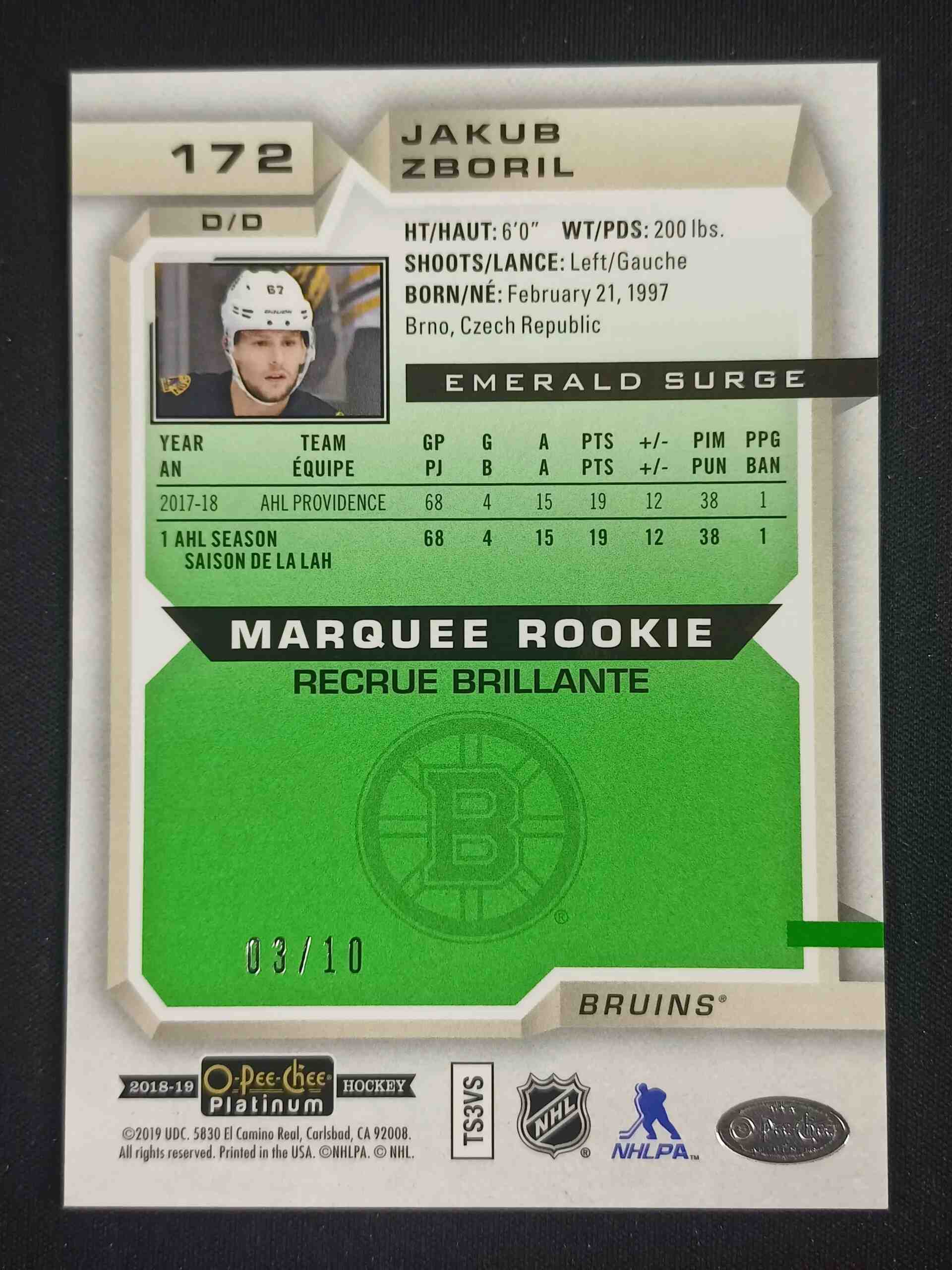 Sběratelská karta 2018/2019 Upper Deck OPC Platinum Emerald Surge Marquee Rookie 172 Jakub Zboril Paralel 03/10