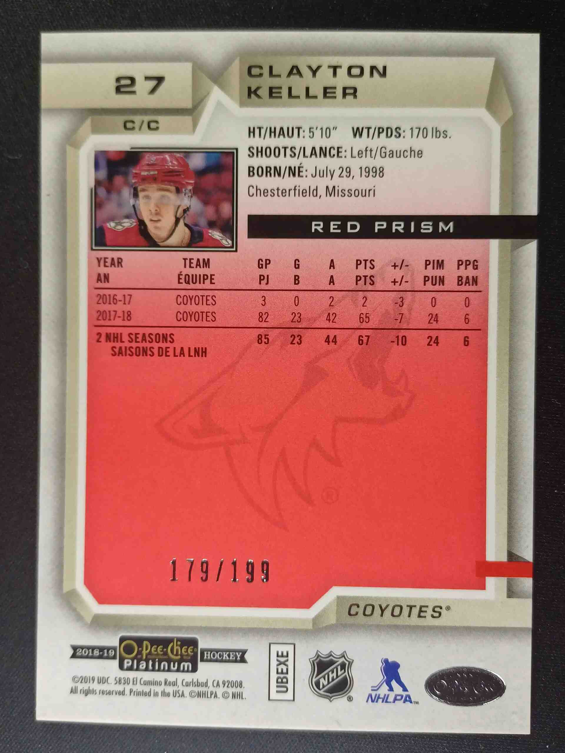 Sběratelská karta 2018/2019 Upper Deck OPC Platinum Red Prism 27 Clayton Keller Paralel 179/199