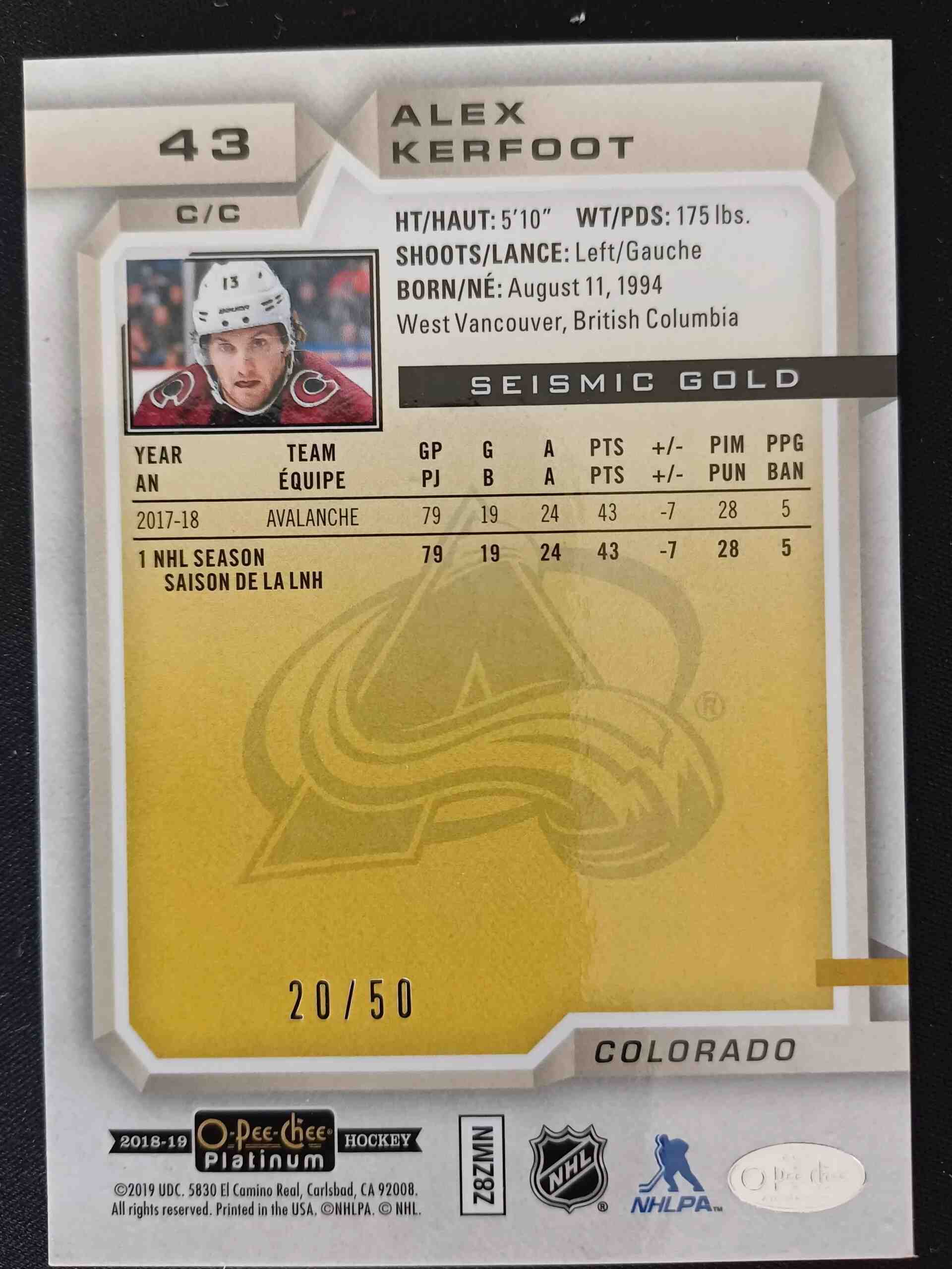 Sběratelská karta 2018/2019 Upper Deck OPC Platinum Seismic Gold 43 Alex Kerfoot Paralel 20/50