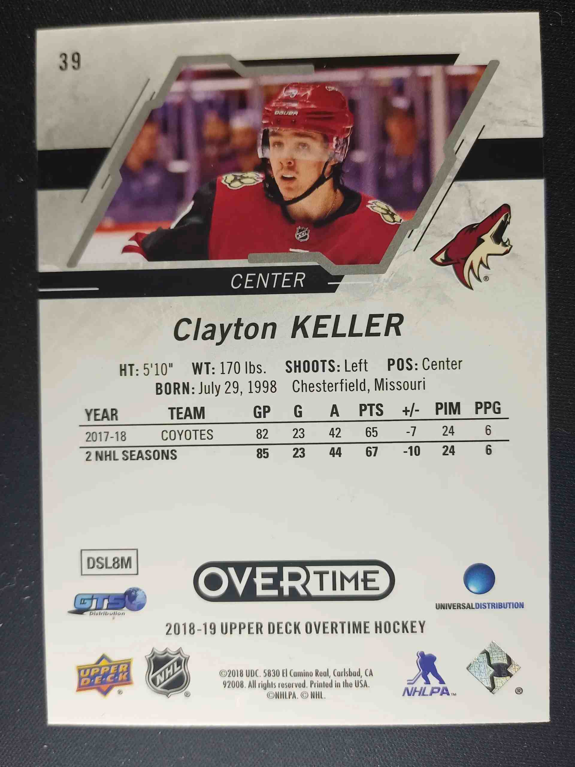 Sběratelská karta 2018/2019 Upper Deck Overtime Blue 39 Clayton Keller Inzert
