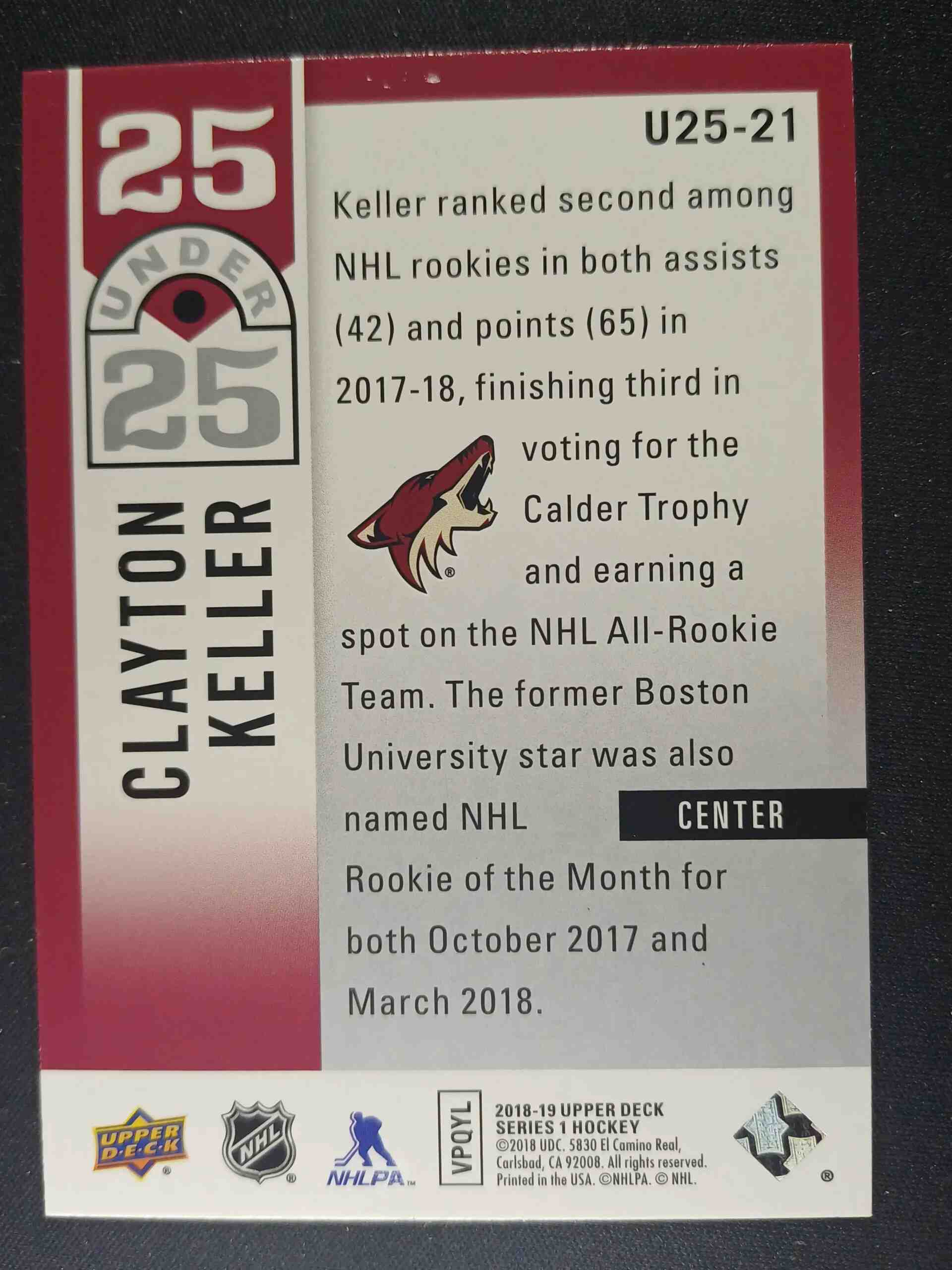 Sběratelská karta 2018/2019 Upper Deck Series 1 25U25 U25-21 Clayton Keller Inzert