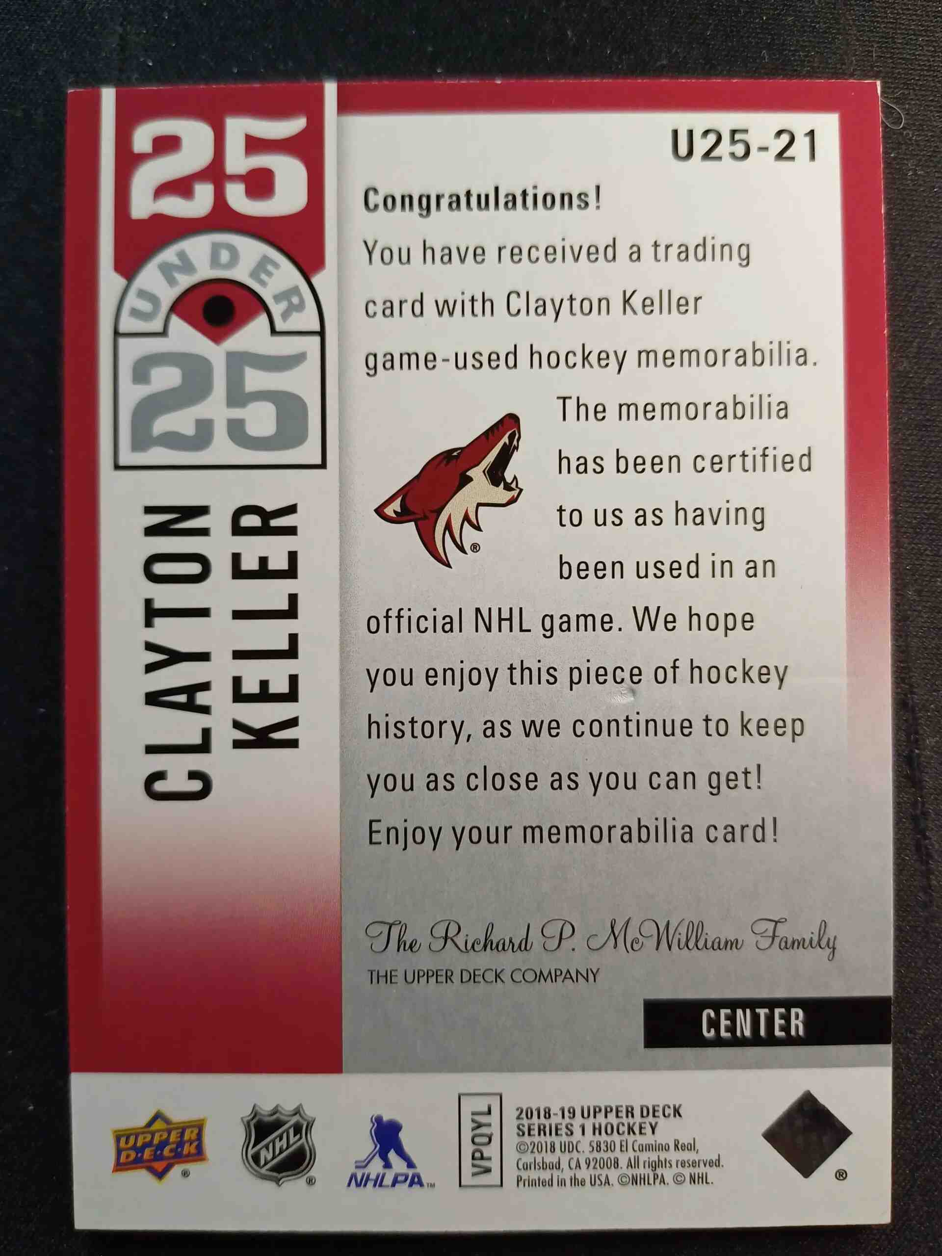 Sběratelská karta 2018/2019 Upper Deck Series 1 25U25 U25-21 Clayton Keller Jersey 049/250