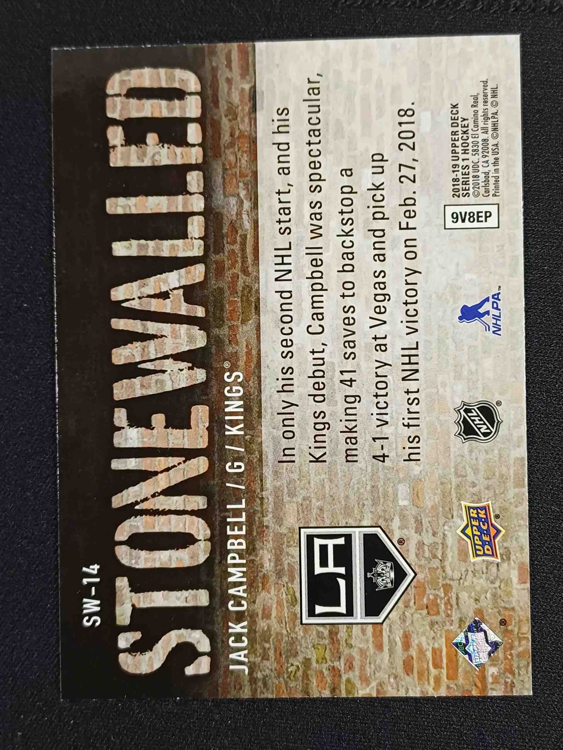 Sběratelská karta 2018/2019 Upper Deck Series 1 Stonewalled SW-14 Jack Campbell Inzert