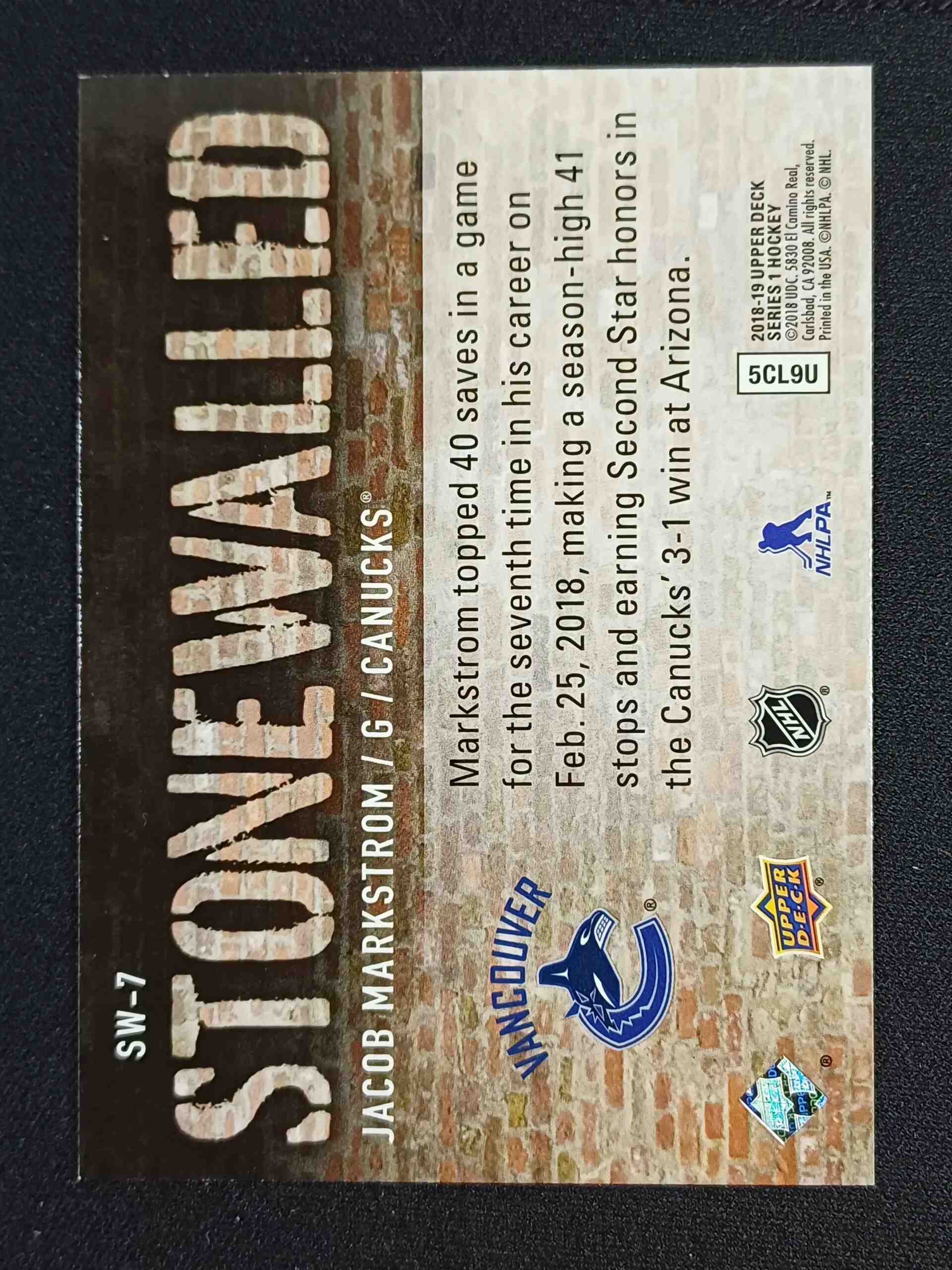 2018/2019 Upper Deck Series 1 Stonewalled SW-7 Jacob Markstrom Inzert