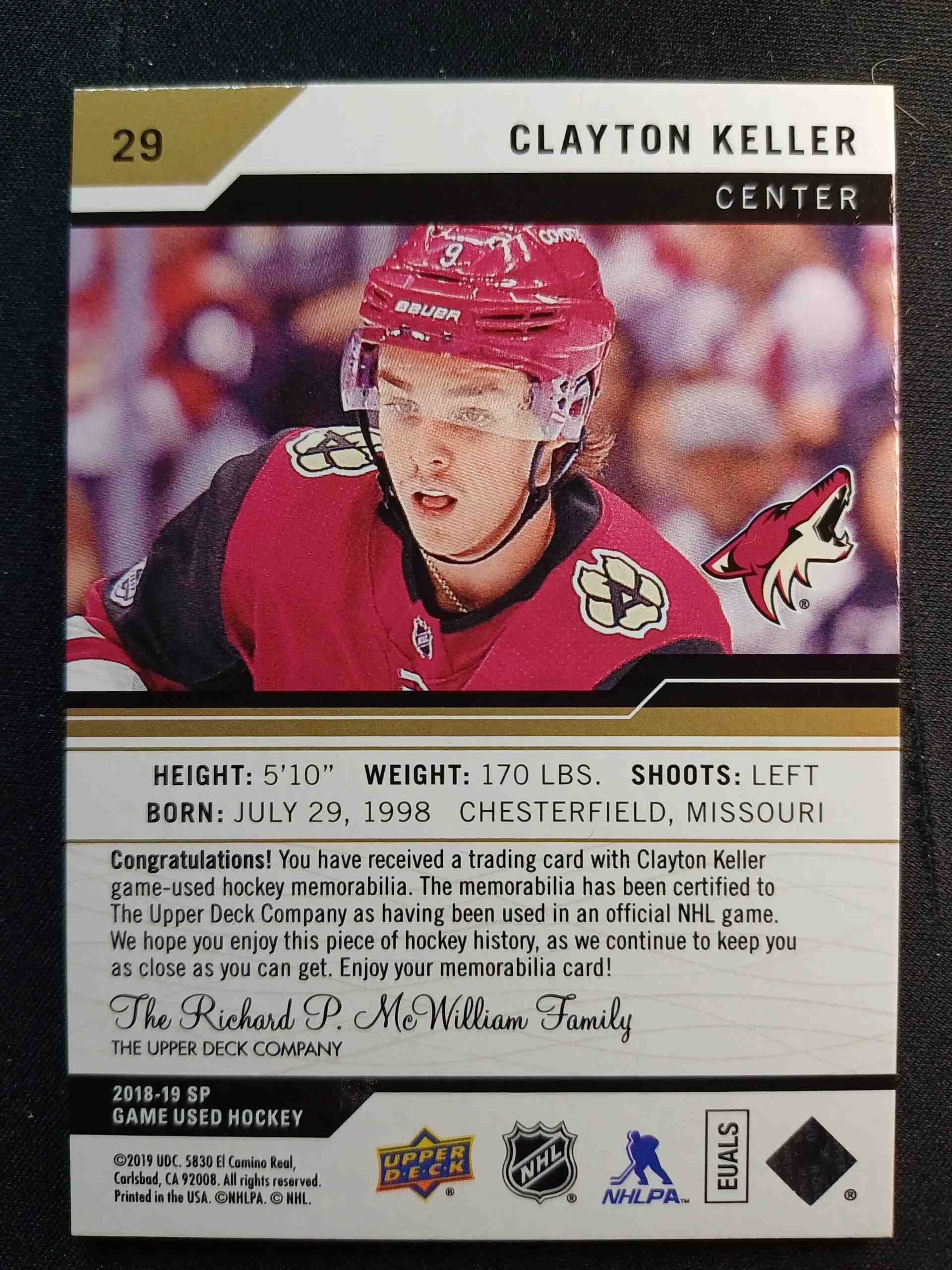 2018/2019 Upper Deck SPGU Base Materials 29 Clayton Keller Jersey
