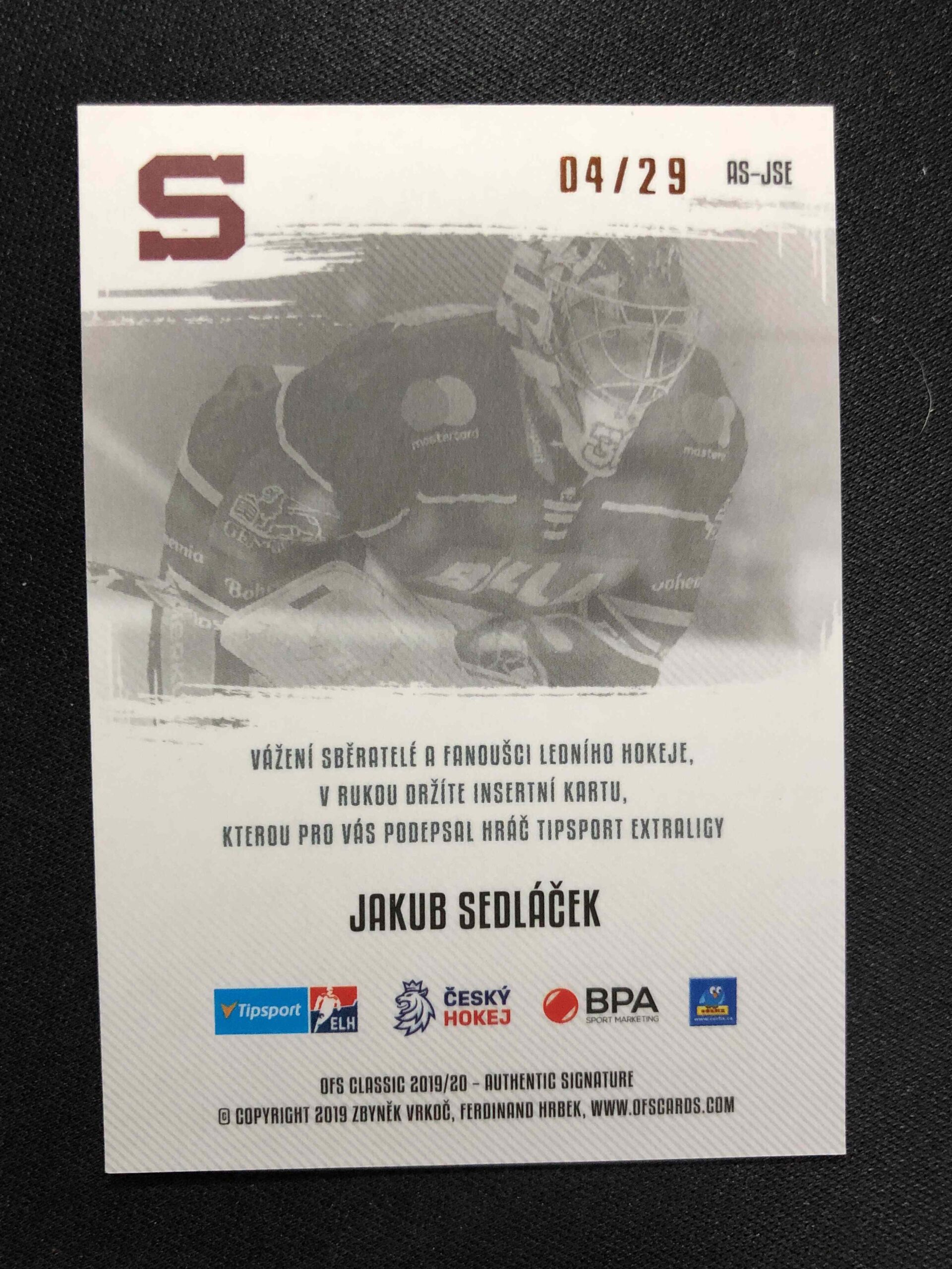 Sběratelská karta 2019/2020 OFS Classic Authentic Signature Level 1 AS-JSE Jakub Sedláček AUTO 04/29
